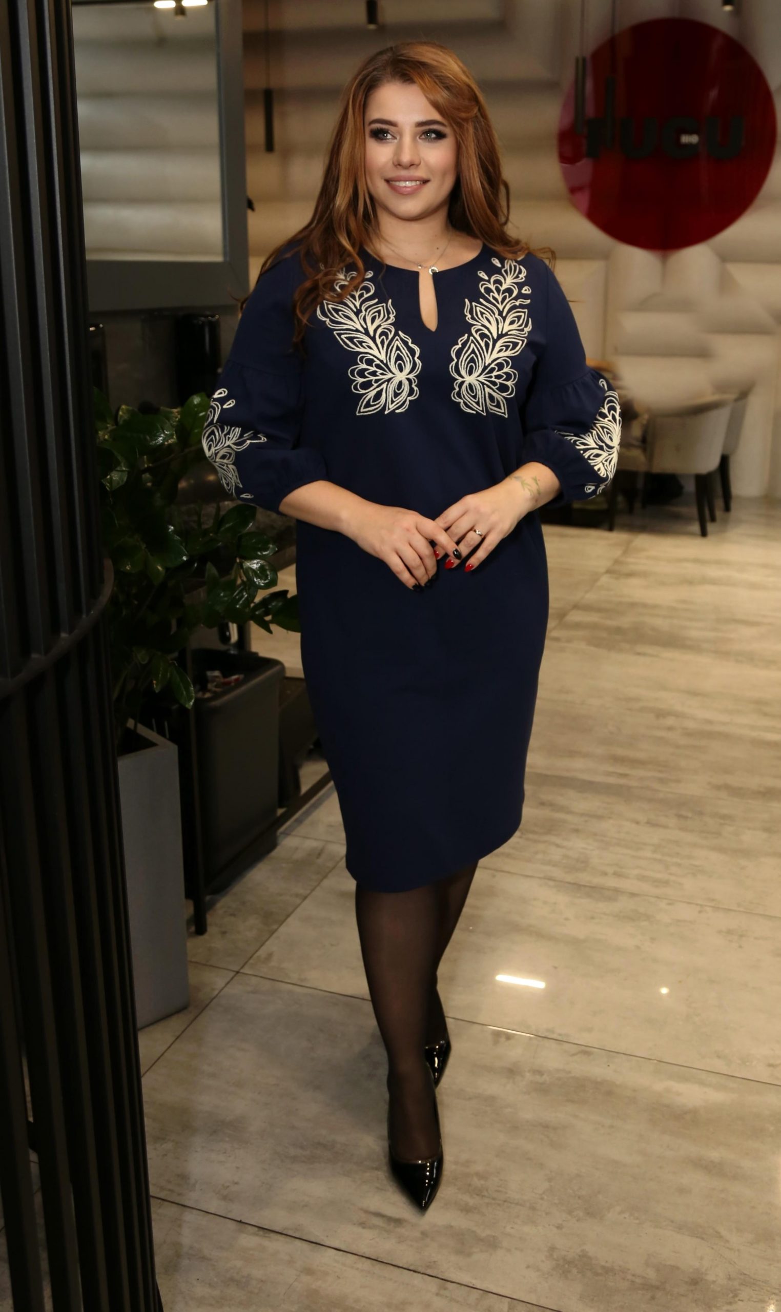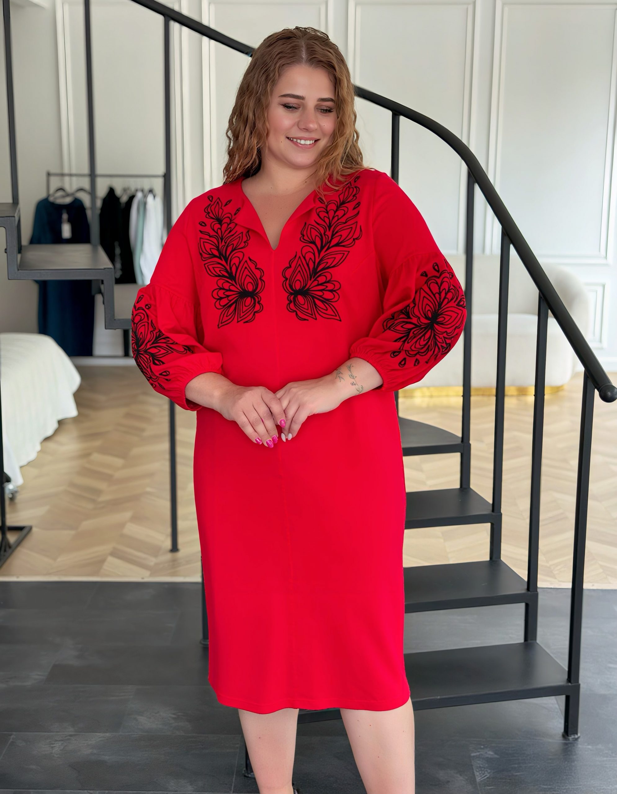 Особый акцент сделан на крупной вышивке по передней части и рукавам, которая придаёт платью изысканный и утончённый вид. Прямой силуэт визуально вытягивает фигуру и гармонично подходит для женщин с формами, а универсальная длина делает модель практичной как для офиса, так и для праздничных мероприятий.