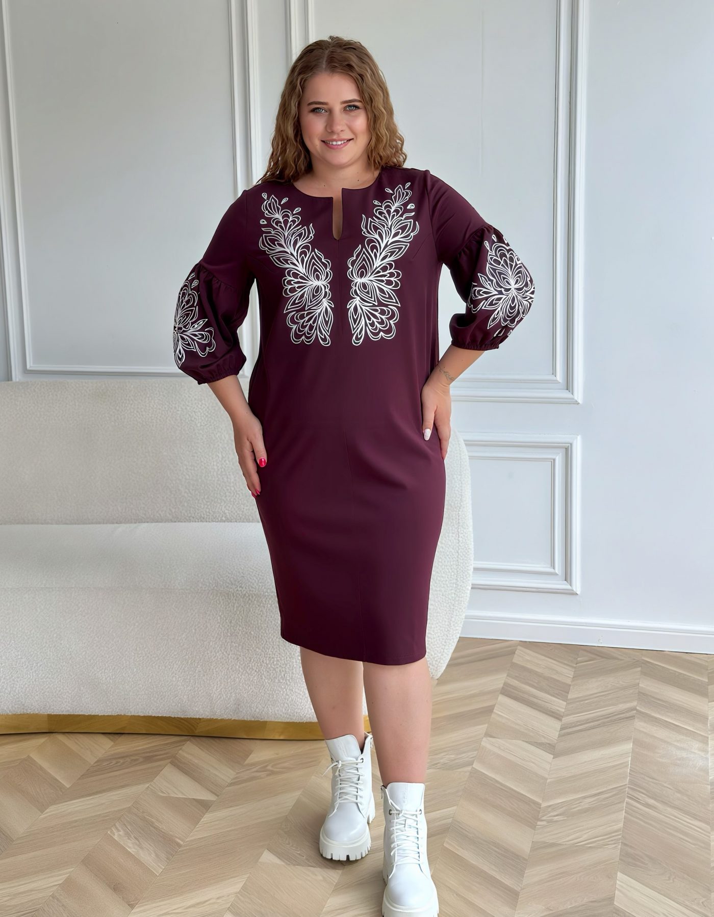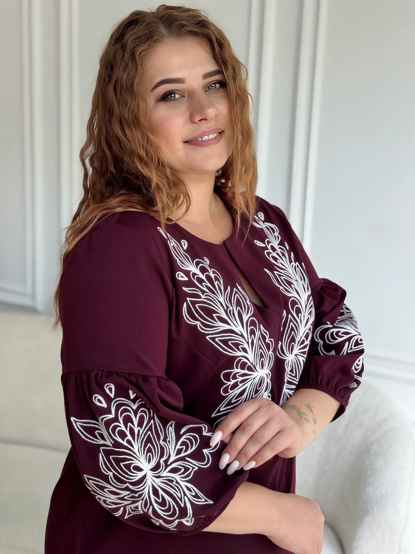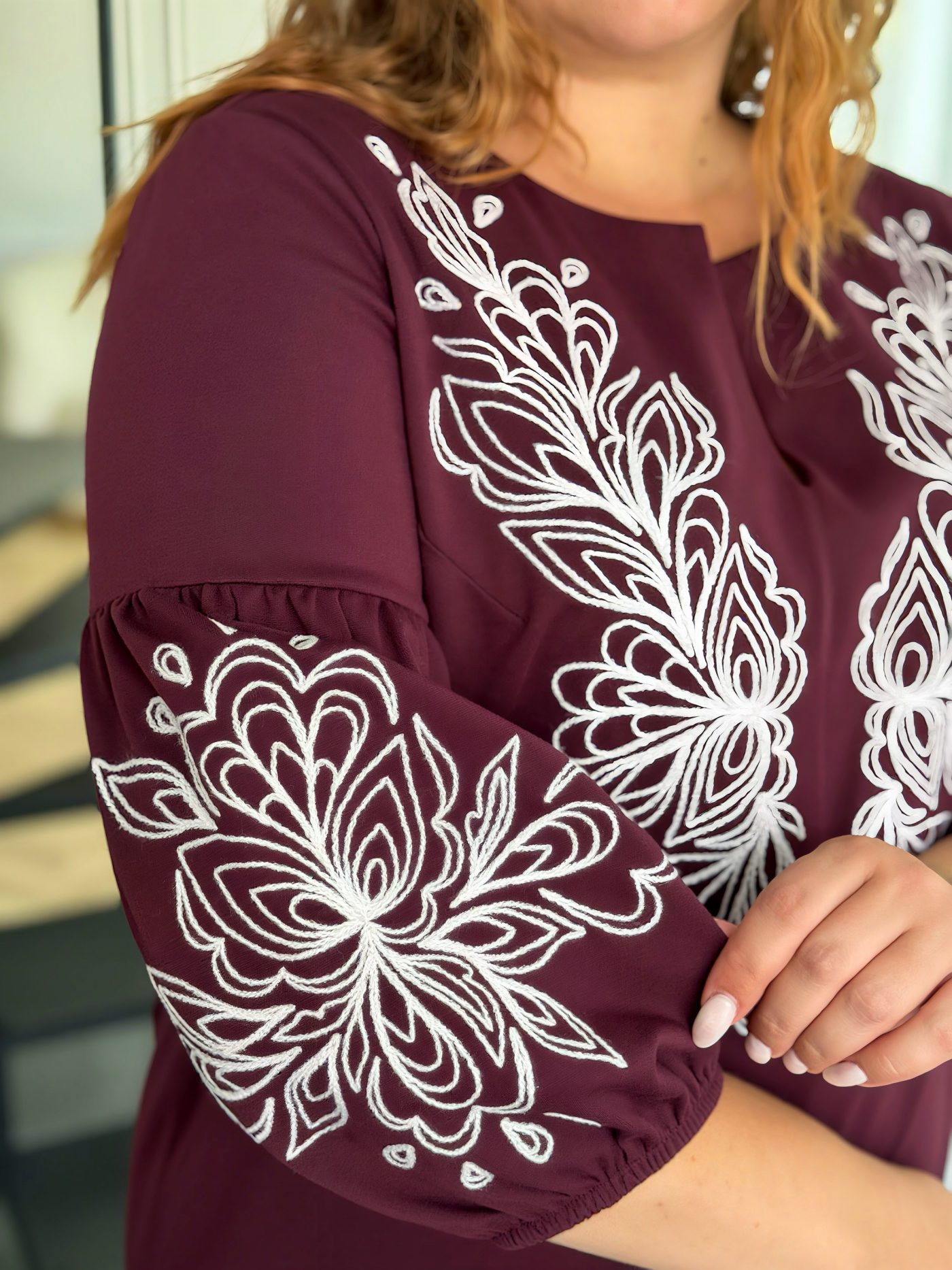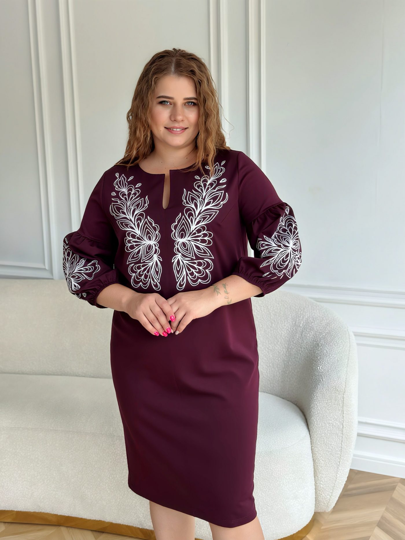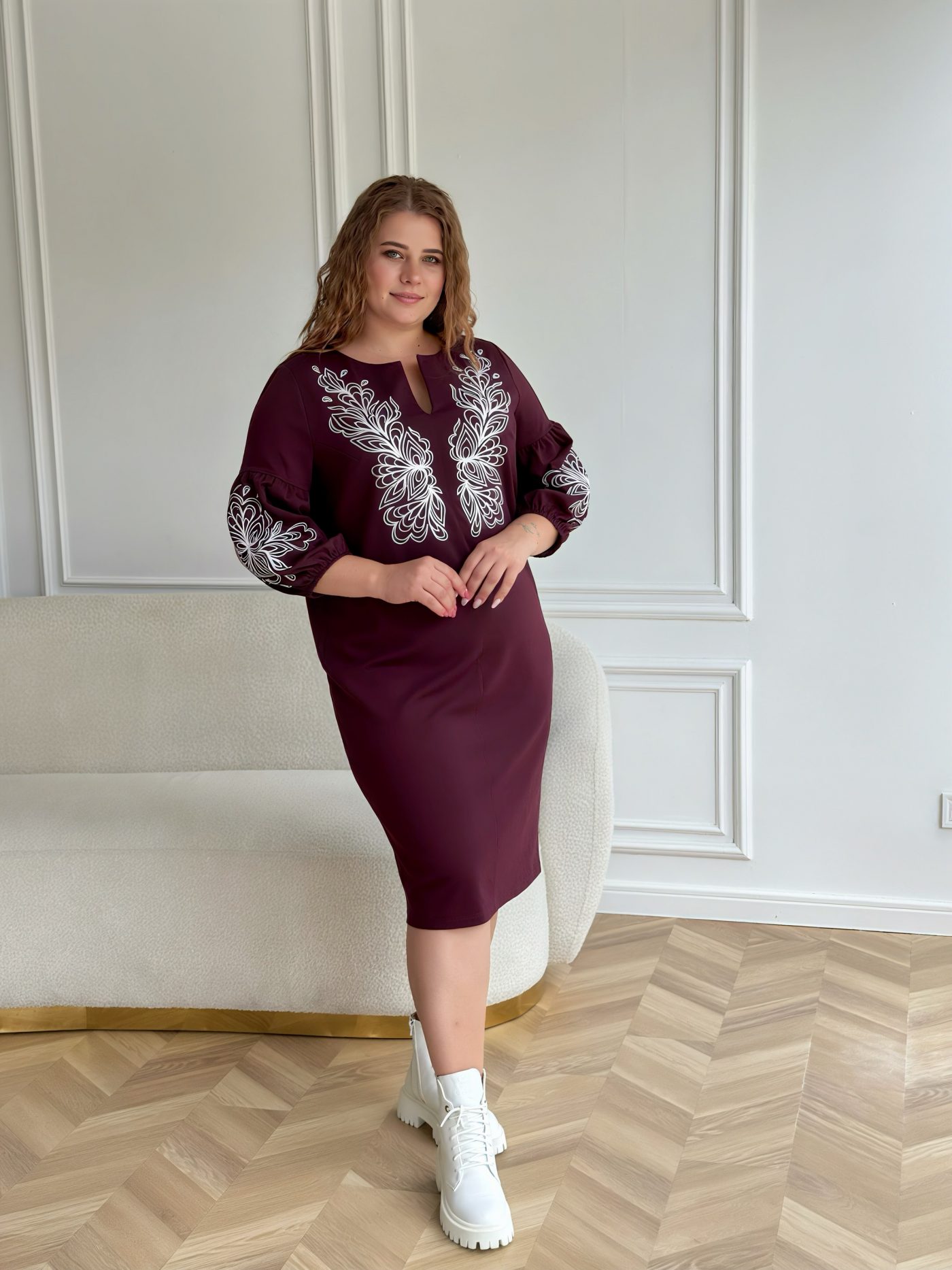 Платье в бордовом цвете с белой вышивкой станет вашим фаворитом в гардеробе для сезона осень-зима. Оно легко сочетается с сапогами или туфлями, подчёркивая женственность и стиль. Подходит для женщин в больших размерах, даря уверенность и комфорт.