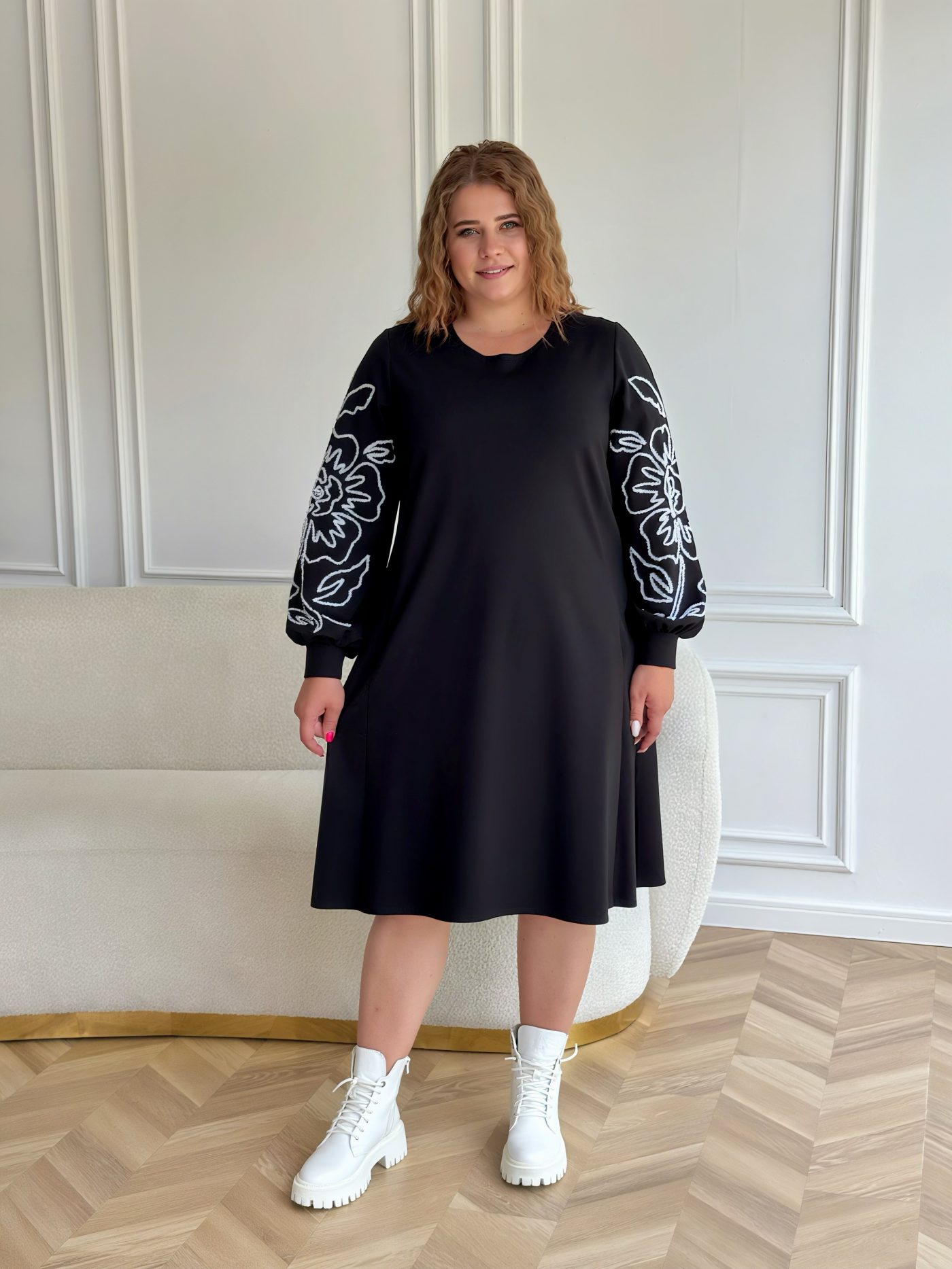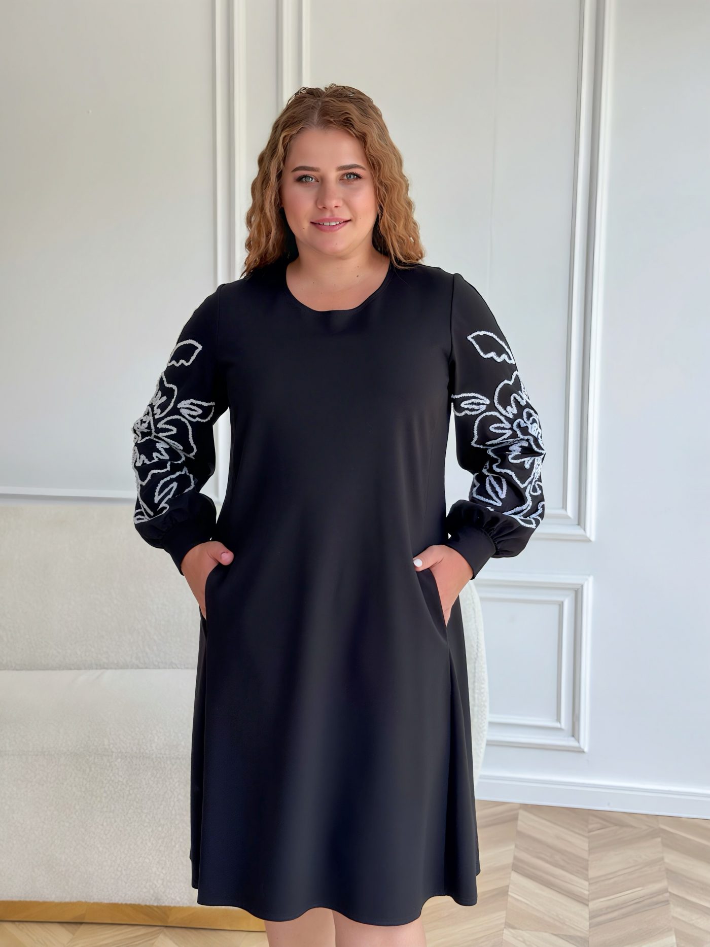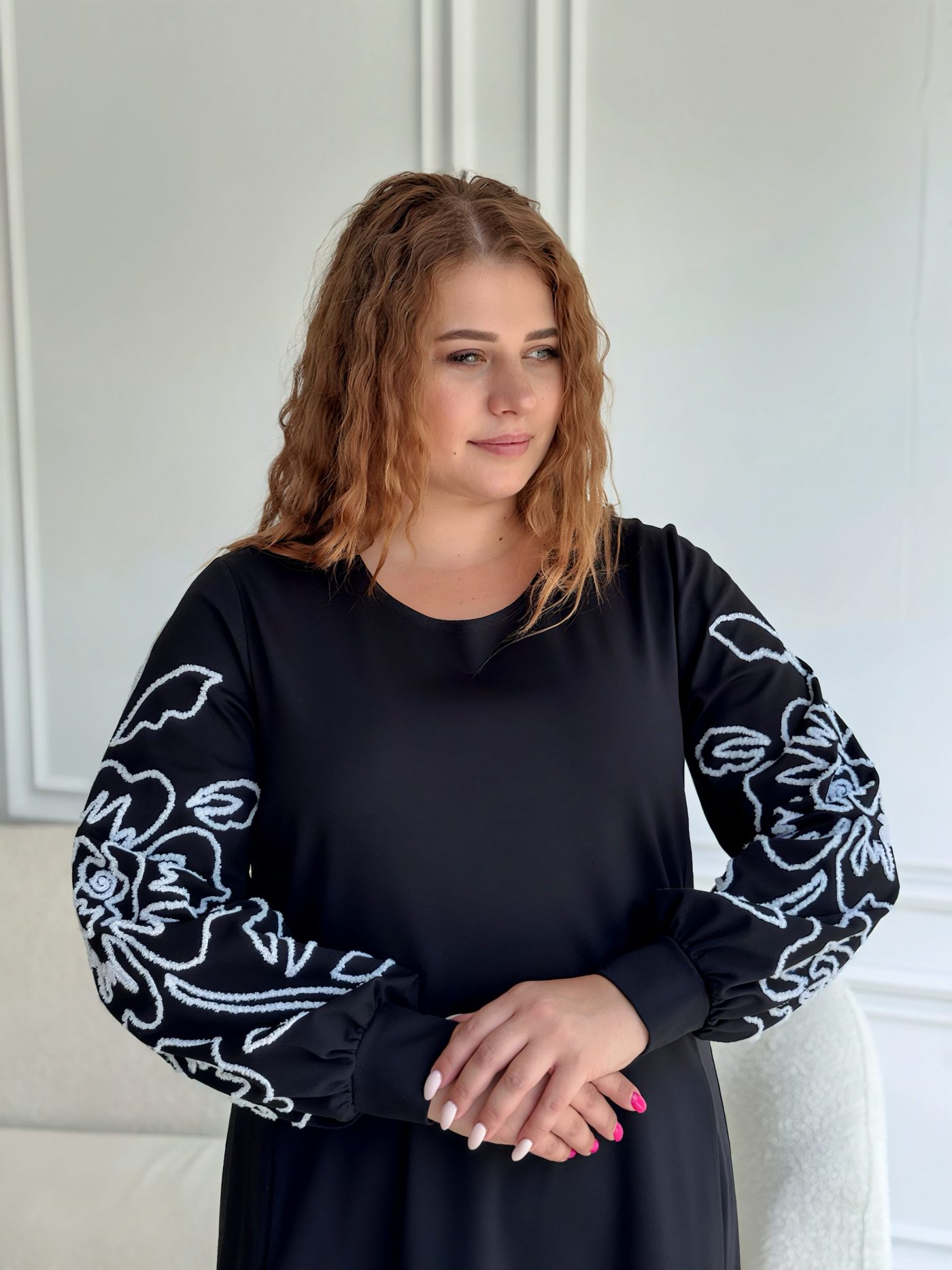 Главная деталь — изысканная белая вышивка на объёмных рукавах. Крупный цветочный орнамент смотрится эффектно и стильно, подчёркивая элегантность чёрного платья. Манжеты придают рукавам аккуратный вид и добавляют нотку современности.