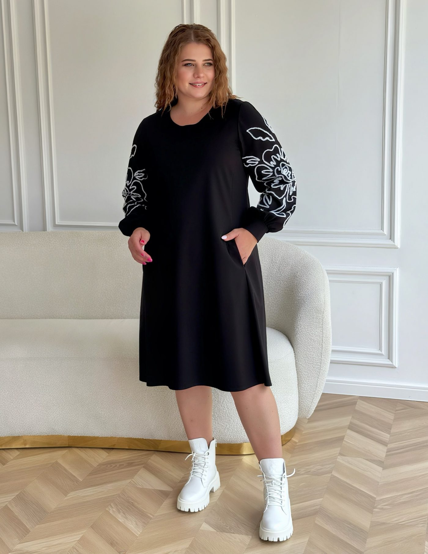 Черное платье-трапеция из французского трикотажа с контрастной вышивкой для женщин plus size