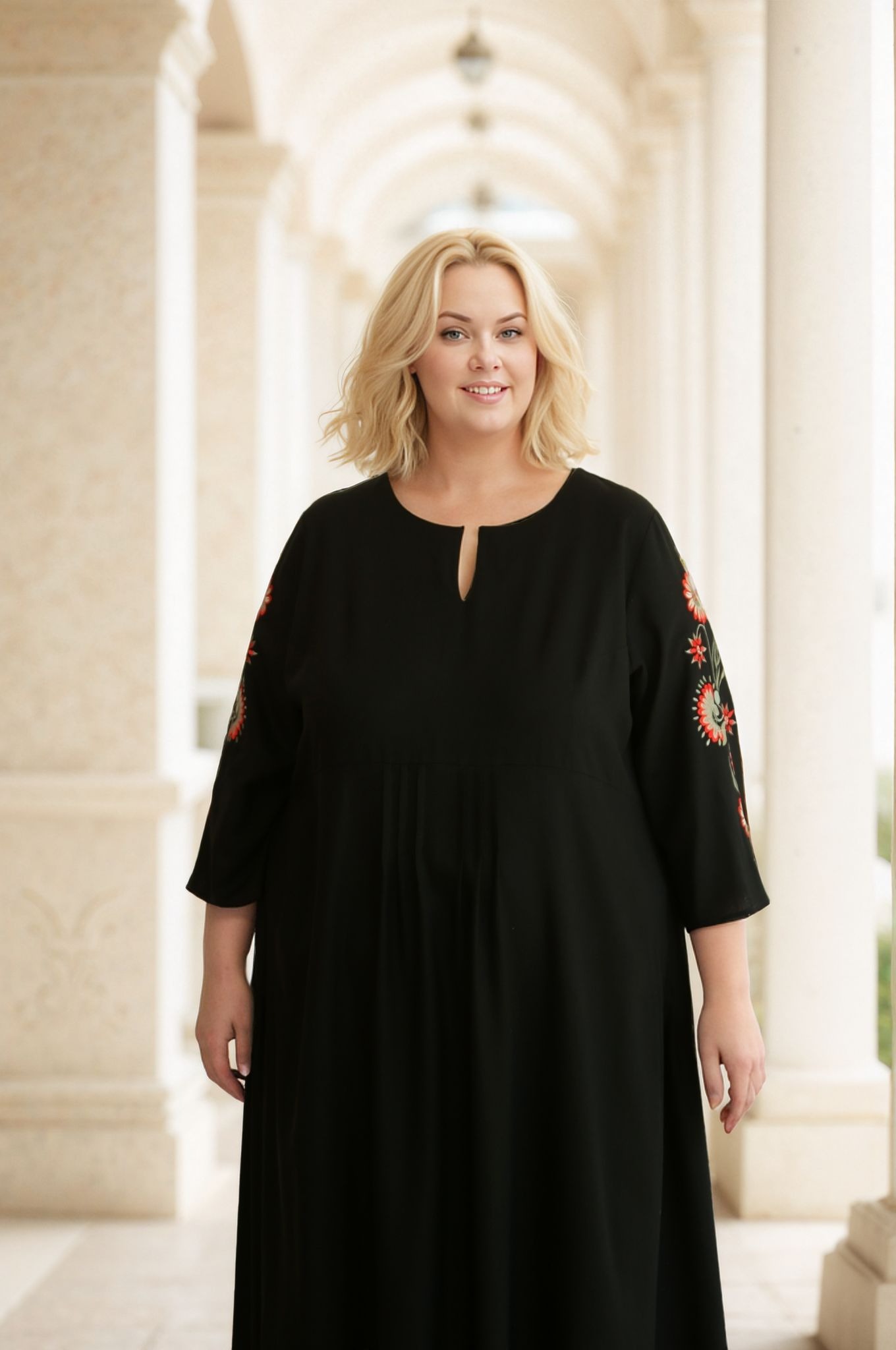 Откройте для себя чёрное платье в стиле бохо больших размеров из натурального льна — идеальное сочетание элегантности, комфорта и свободы. Чёрный цвет делает эту модель универсальной и подходящей как для повседневных образов, так и для вечерних выходов.