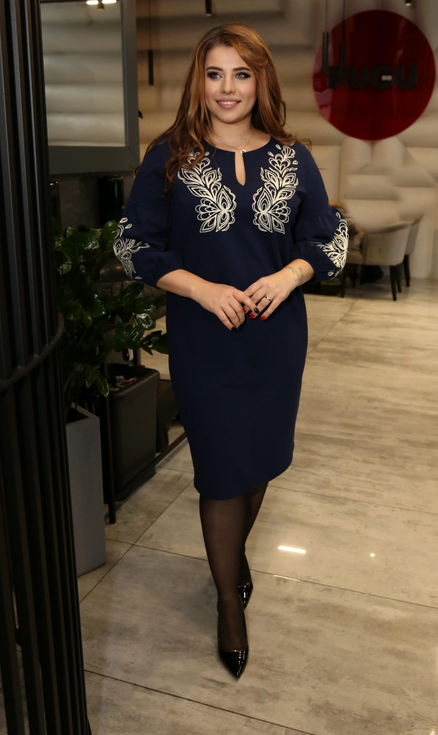 Синее платье прямого кроя с вышивкой – французский трикотаж, большие размеры, стиль осень-зима