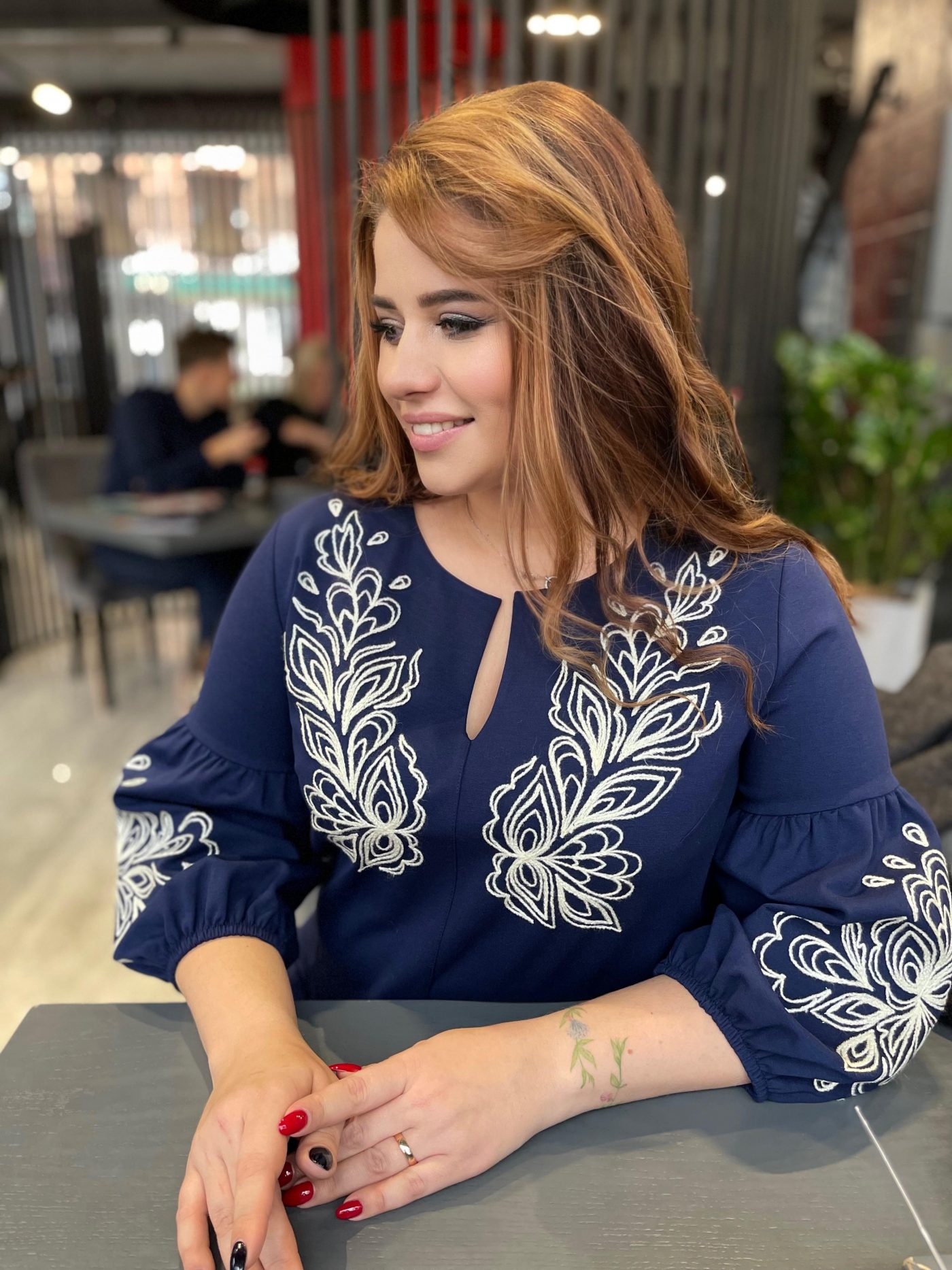 Вышивка на груди и рукавах смотрится эффектно на насыщенном синем фоне, подчеркивает индивидуальность и придает образу нотку изысканности. Объемные рукава с декоративной сборкой добавляют утонченности и визуально облегчают силуэт.