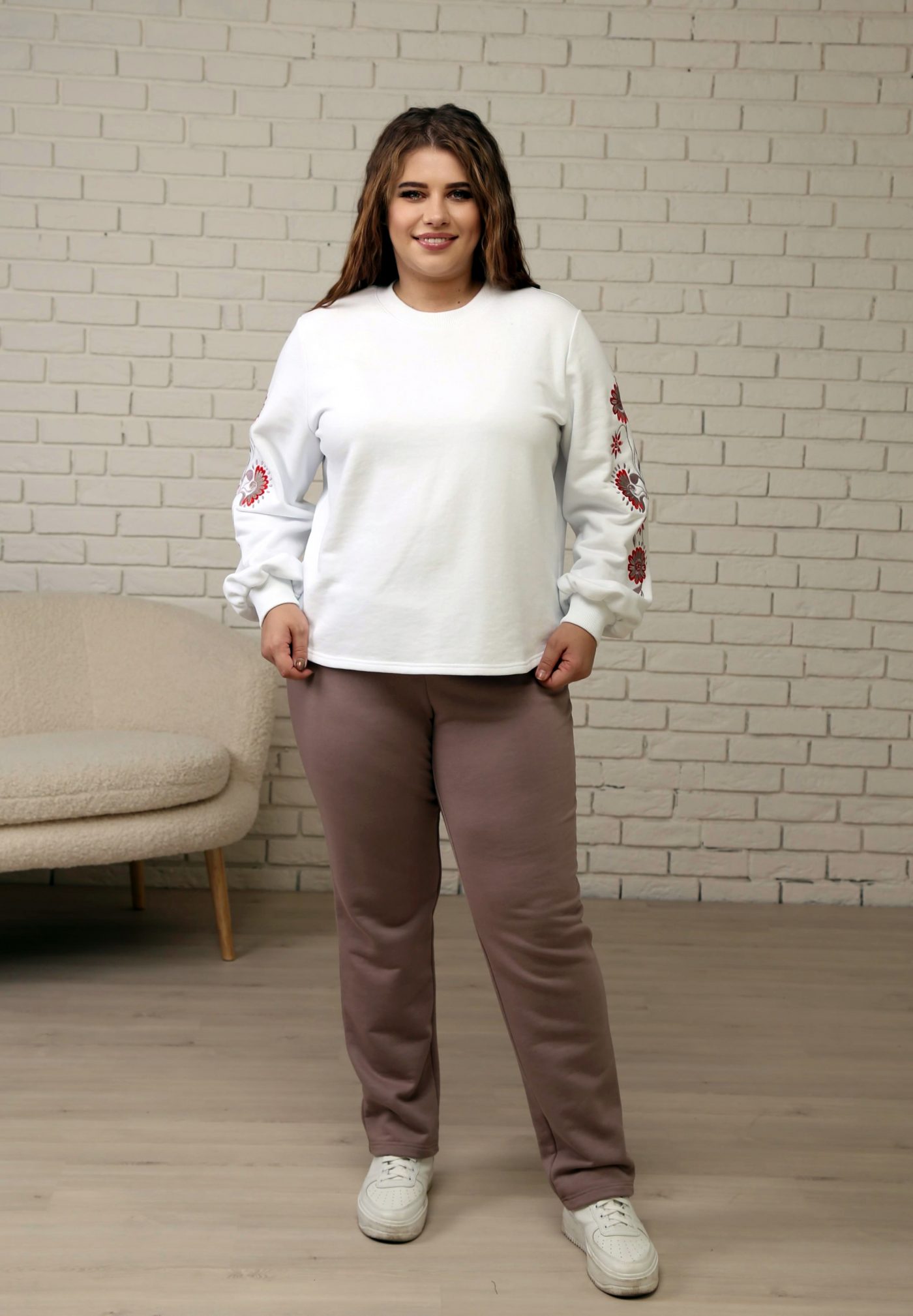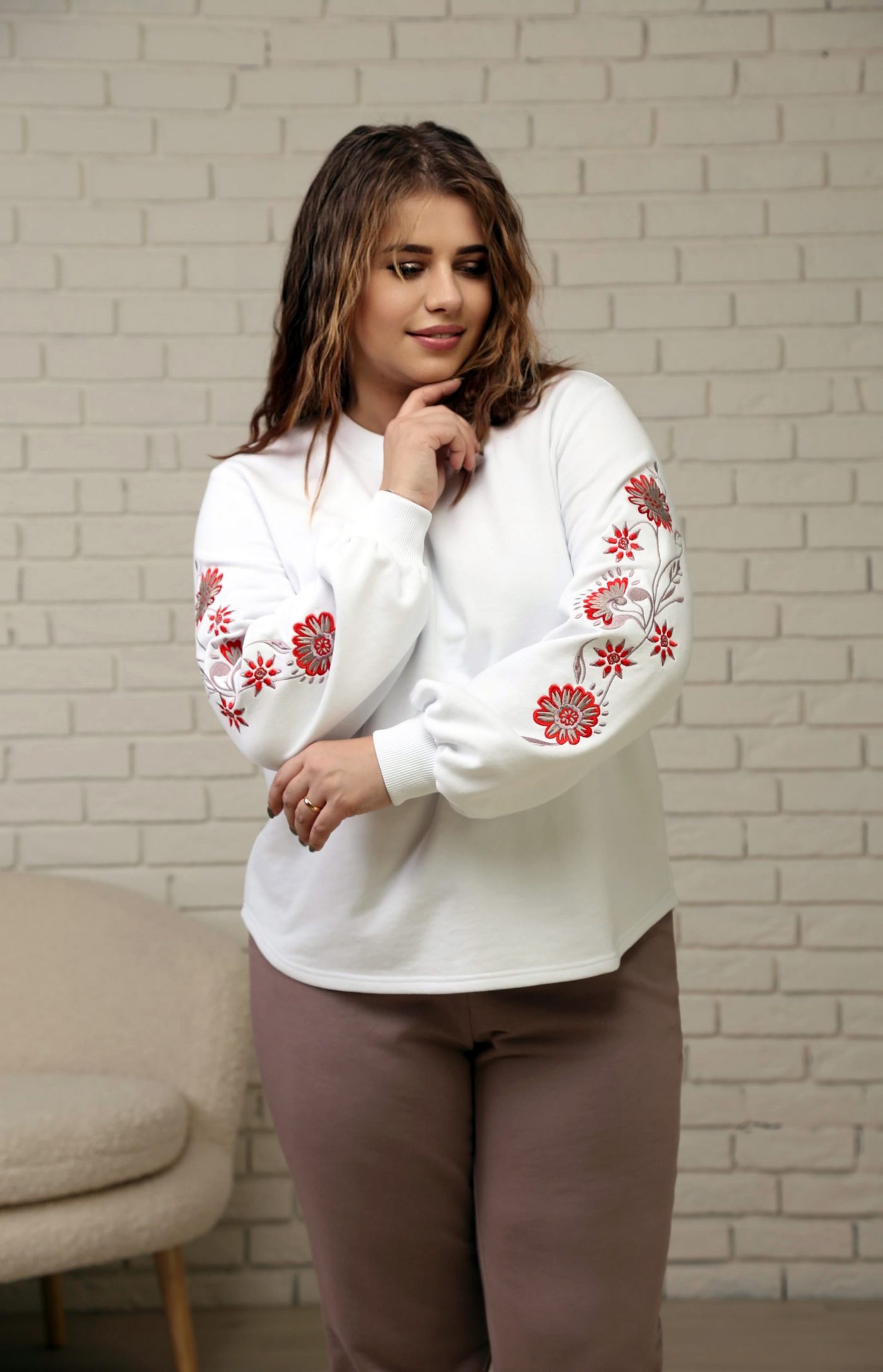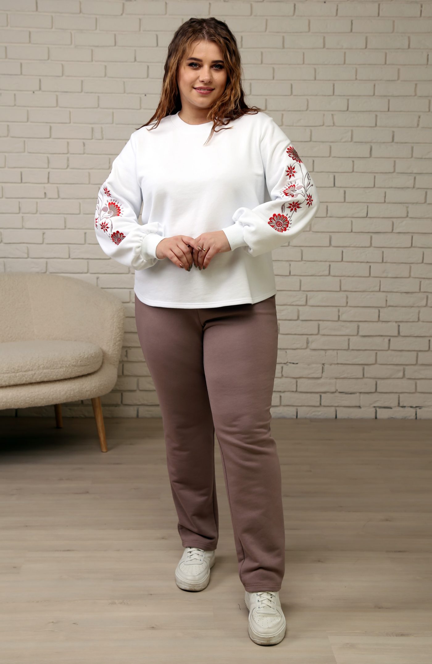 Верх костюма — белый свитшот свободного кроя с изысканной вышивкой красно-бордовых цветов на рукавах, которая придаёт образу женственность и нарядность. Объёмные рукава с манжетами добавляют актуальности и делают силуэт лёгким и утончённым.