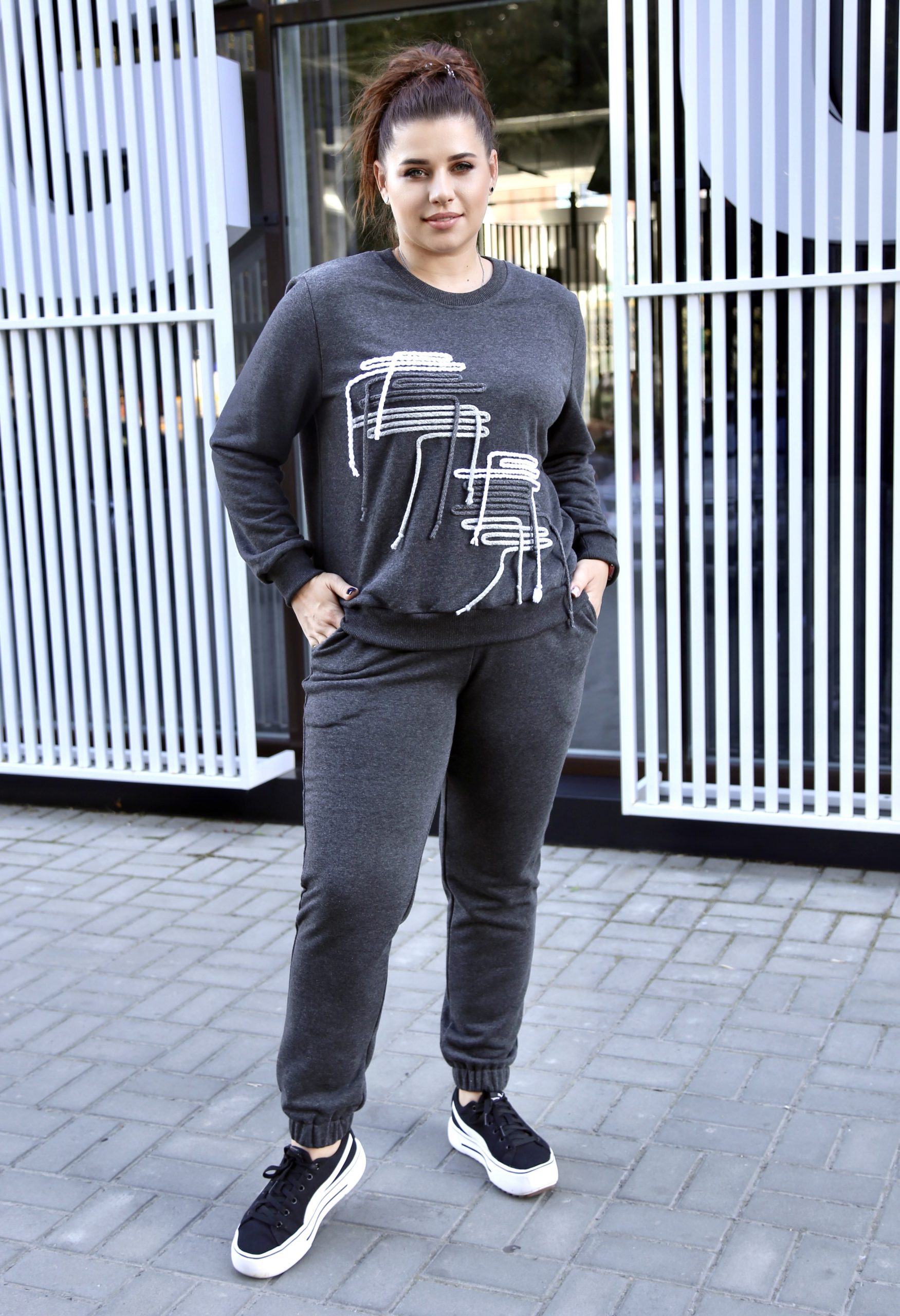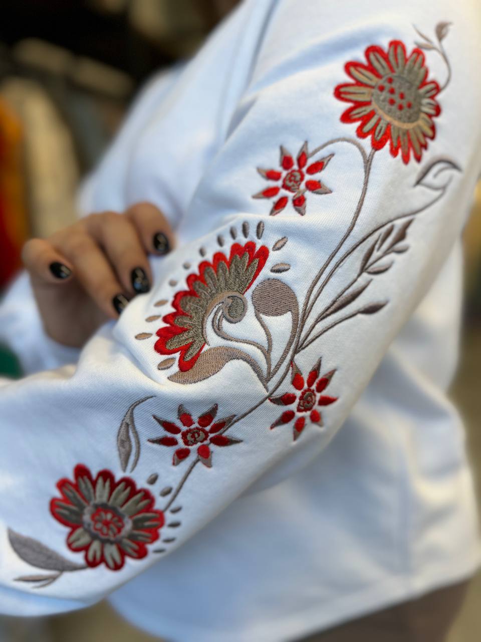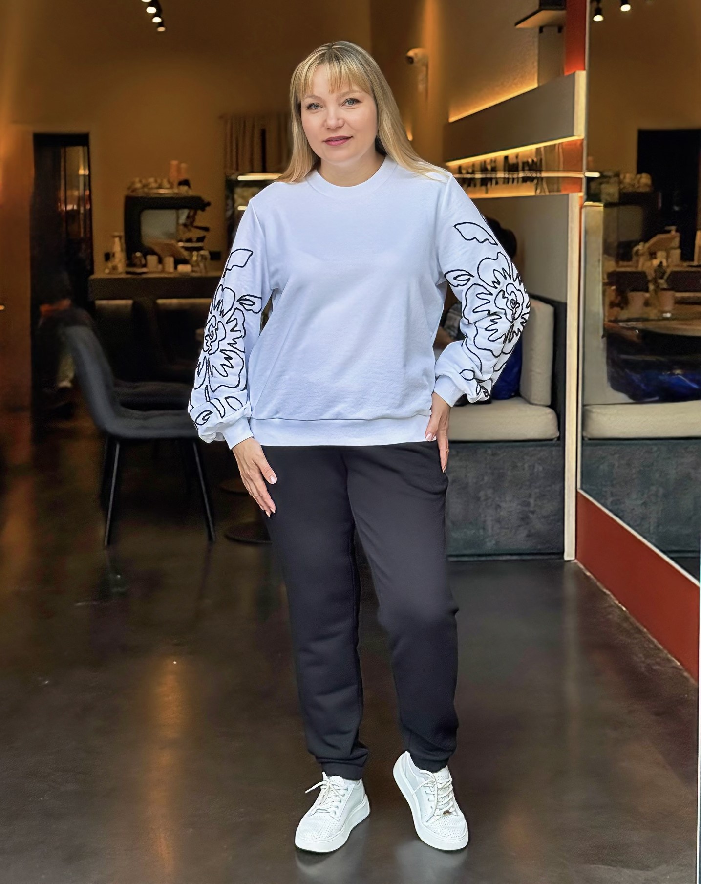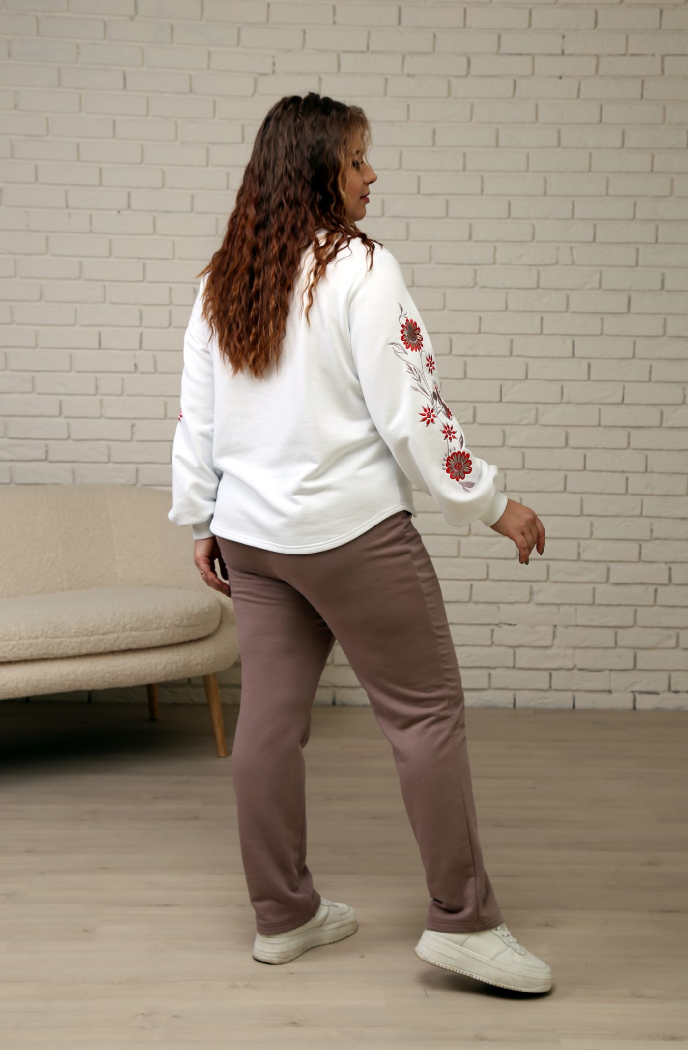 Верх костюма — белый свитшот свободного кроя с изысканной вышивкой красно-бордовых цветов на рукавах, которая придаёт образу женственность и нарядность. Объёмные рукава с манжетами добавляют актуальности и делают силуэт лёгким и утончённым.