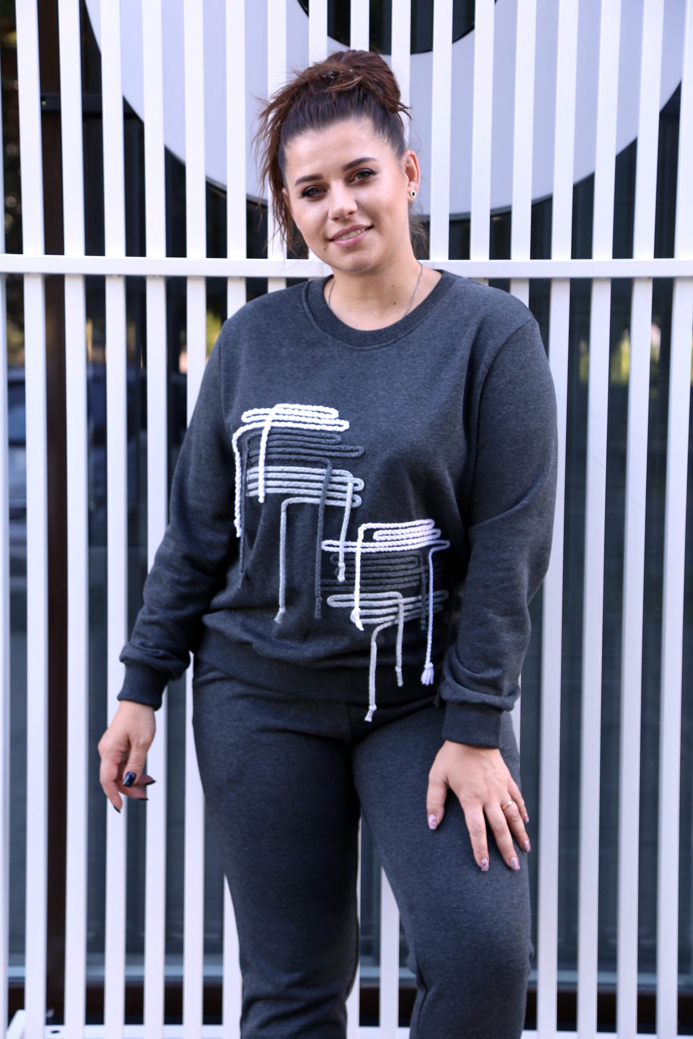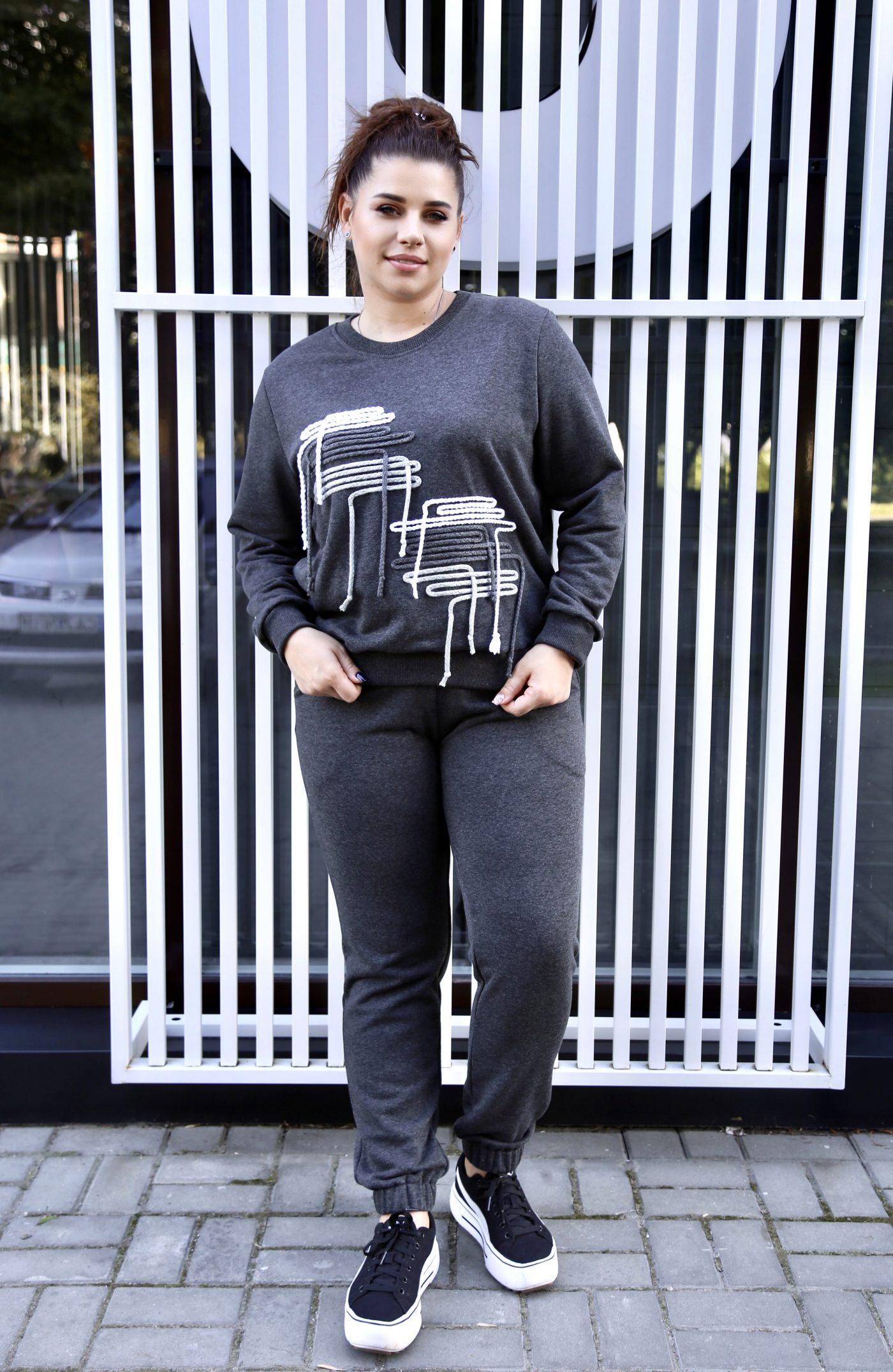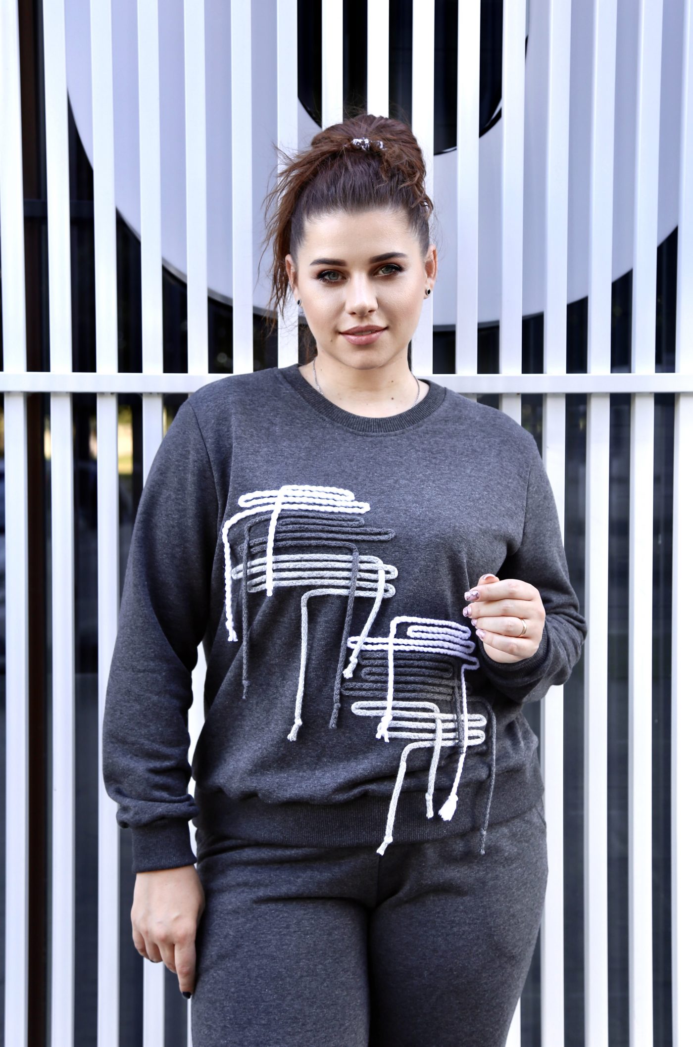 Костюм состоит из свитшота свободного кроя и брюк с удобными карманами. Эластичные манжеты на рукавах и по низу брюк обеспечивают идеальную посадку и комфорт при движении. Главный акцент — объемная дизайнерская вышивка белыми шнурами, создающая модный рельеф и добавляющая костюму нарядности и оригинальности.