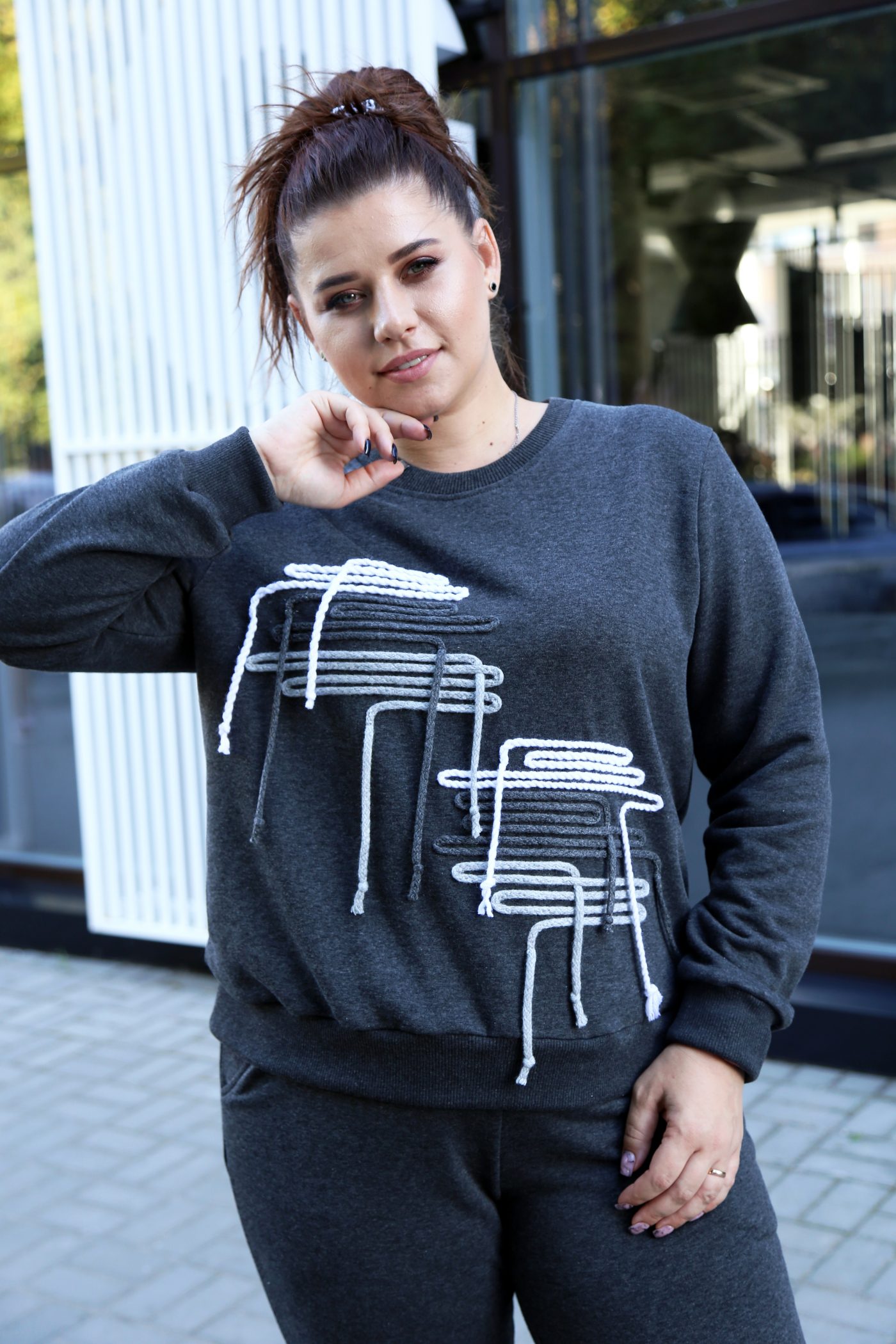 Женский спортивный костюм цвета антрацит с оригинальной белой вышивкой шнуром — это сочетание комфорта, стиля и индивидуальности. Модель выполнена из плотного трикотажа 3-х нитка, который идеально подходит для сезона осень-зима-весна: ткань мягкая, тёплая, износостойкая и хорошо держит форму после стирки.