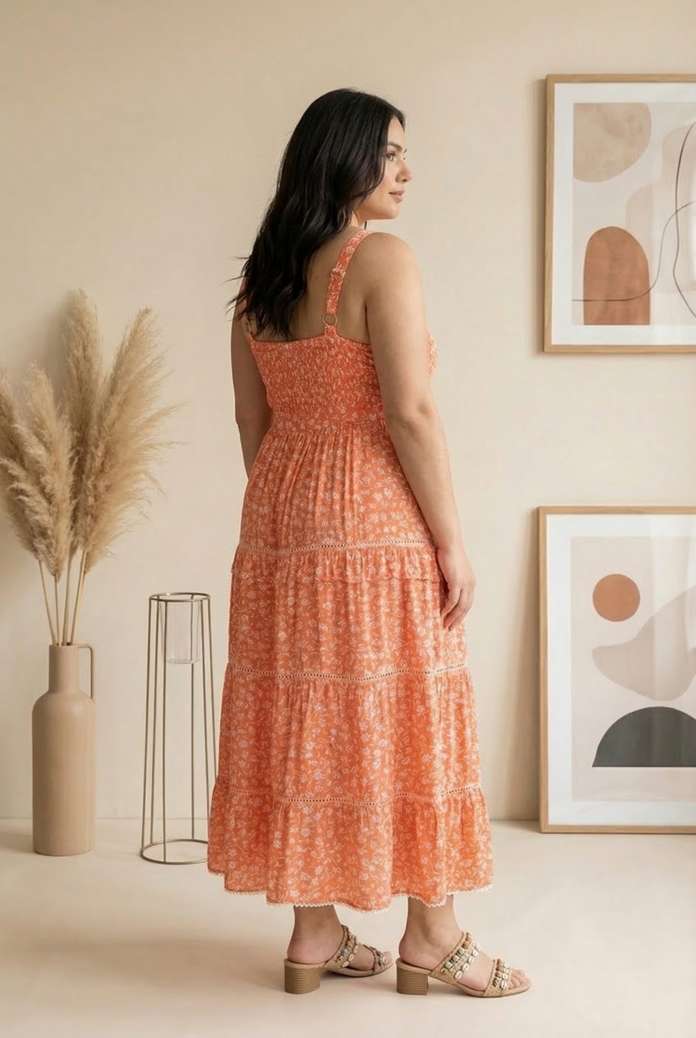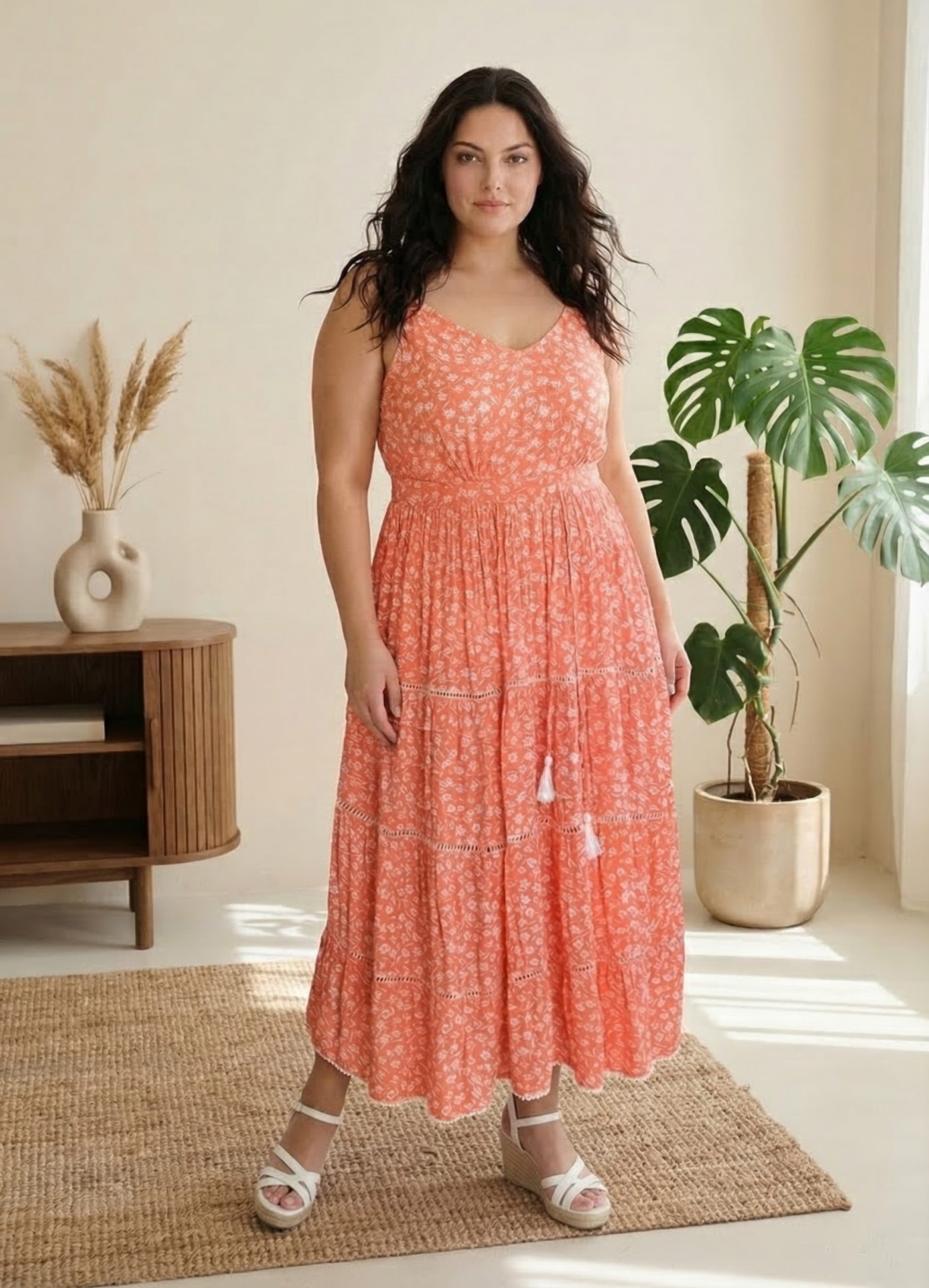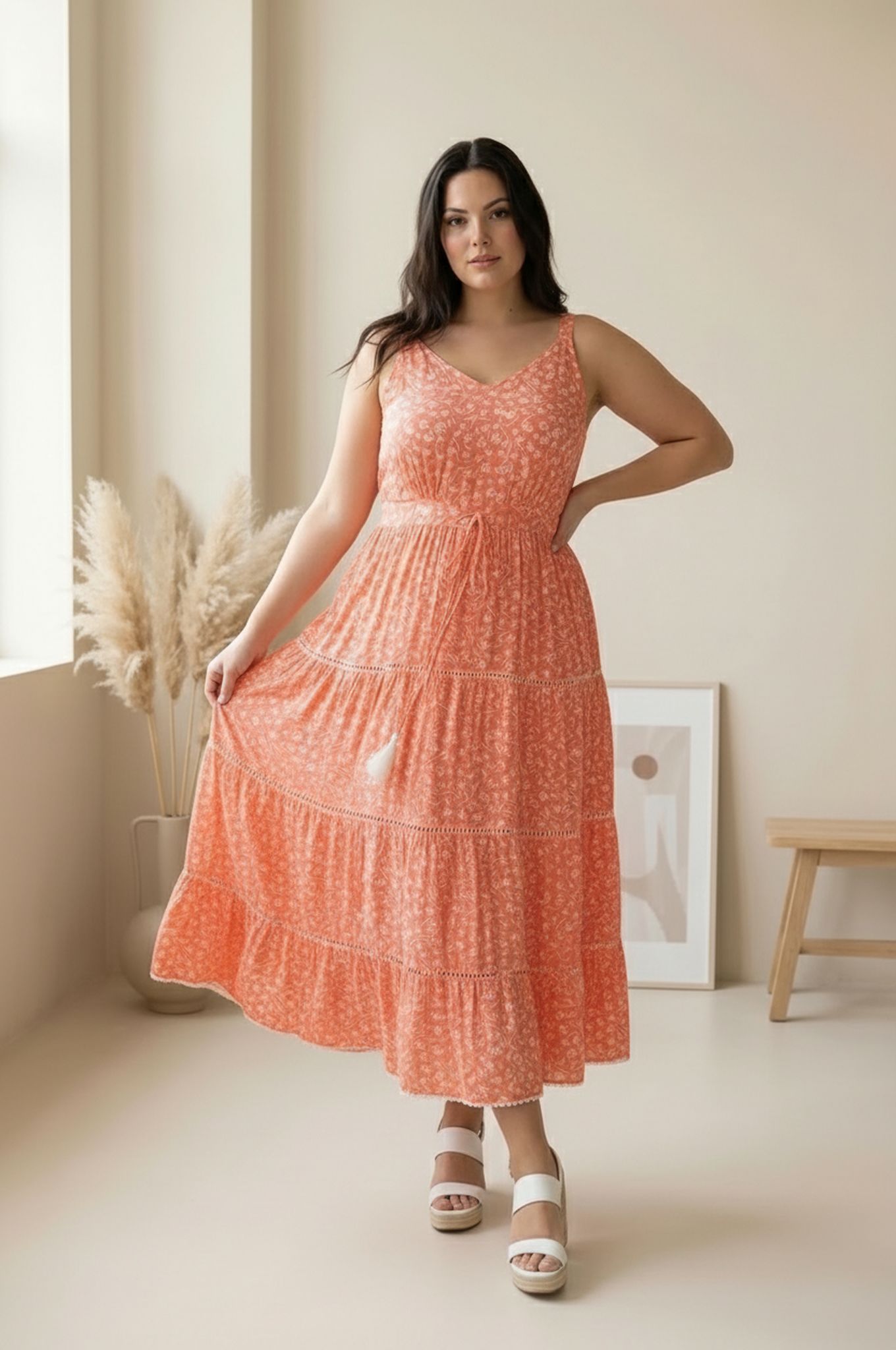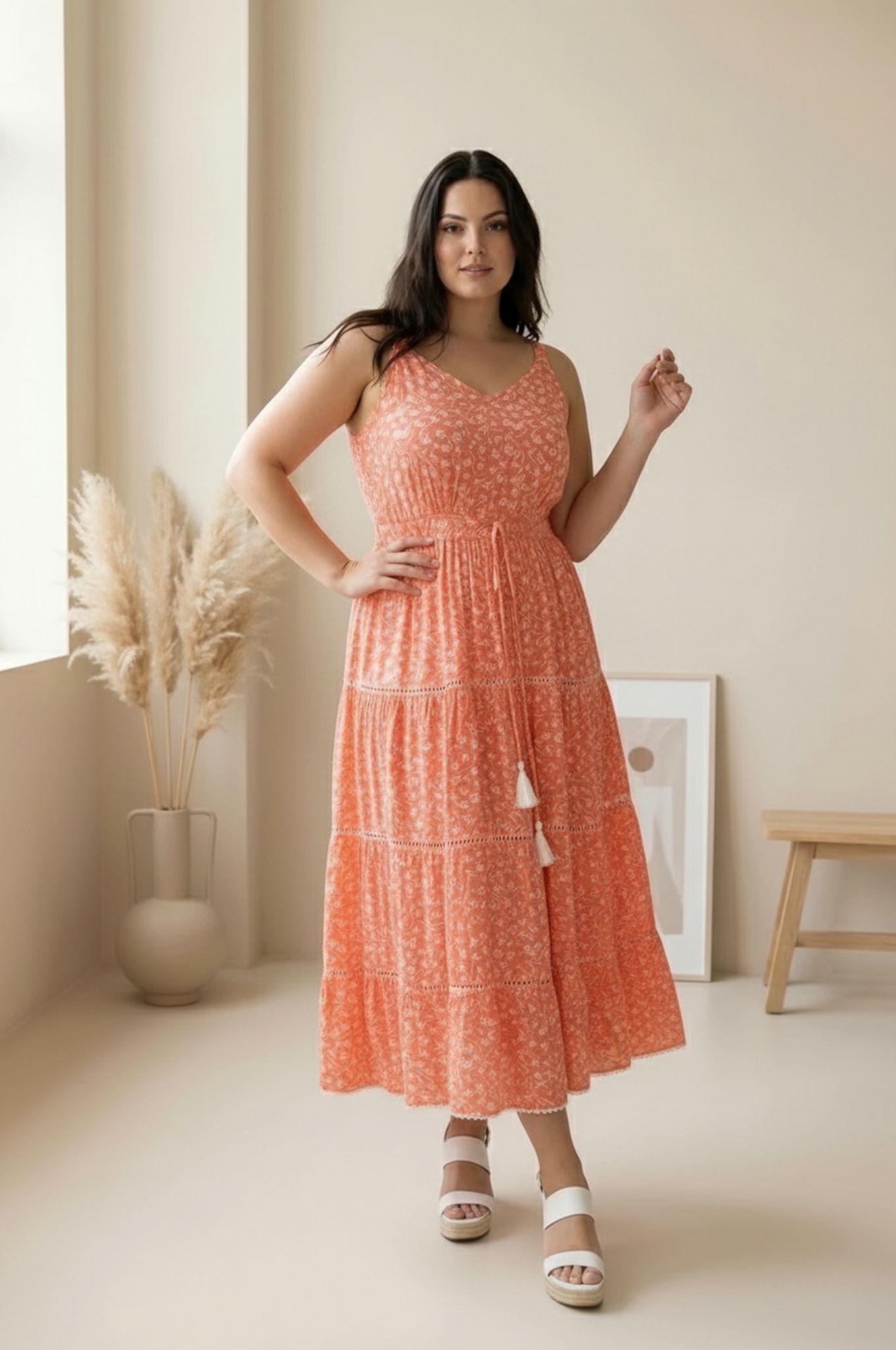 Чарівний сарафан із штапелю з квітковим узором – втілення легкості та романтичності! Ніжна, струмлива тканина штапель приємно прилягає до тіла, не перегріваючи шкіру навіть у найспекотніший день. Вільний силует, завищена талія та повітряні яруси створюють витончений образ. Декоративні пензлики на талії додають акцент, підкреслюючи жіночність моделі. Підходить для жінок із будь-яким типом фігури, доступний у великих розмірах.