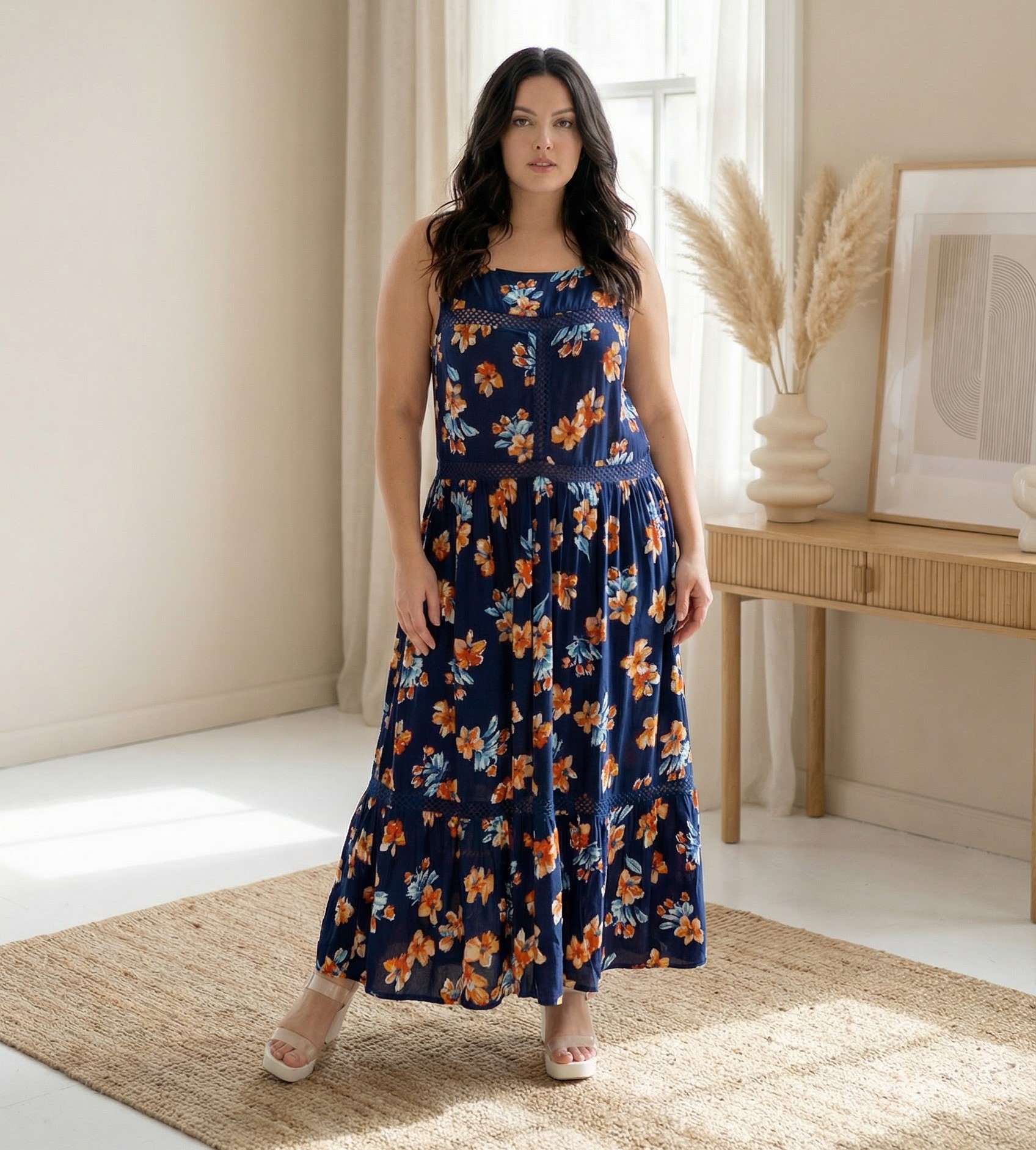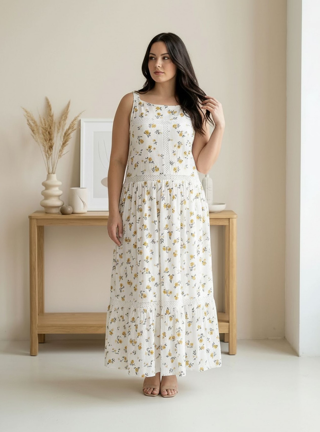 Модель має вільний, м’який крій, який красиво сідає на фігуру та підкреслює жіночність без обмеження рухів. Завдяки продуманому дизайну, цей сарафан великих розмірів із штапеля гармонійно виглядає на різних типах фігури, створюючи легкий і витончений силует.