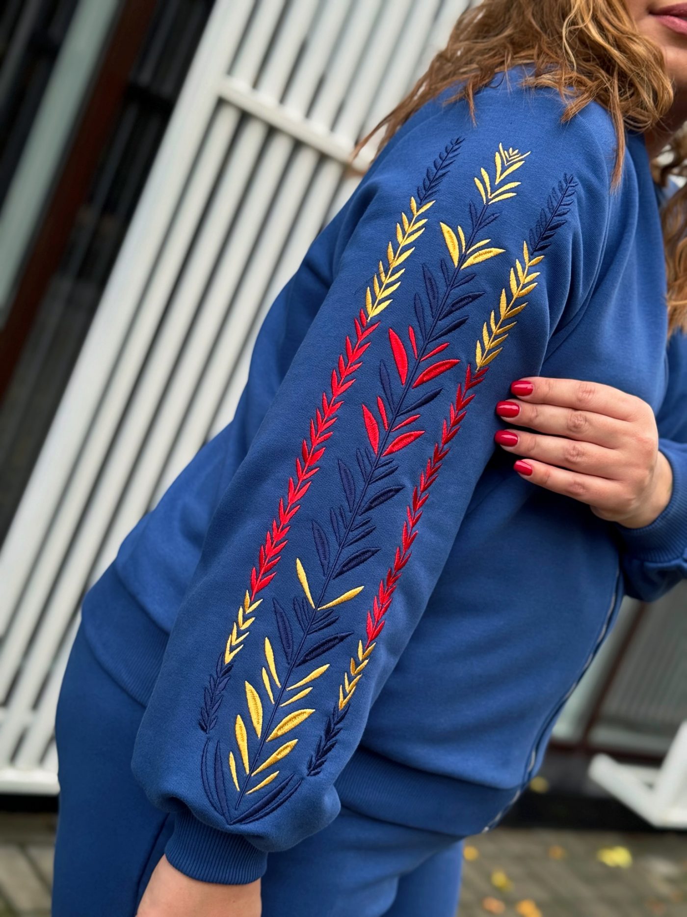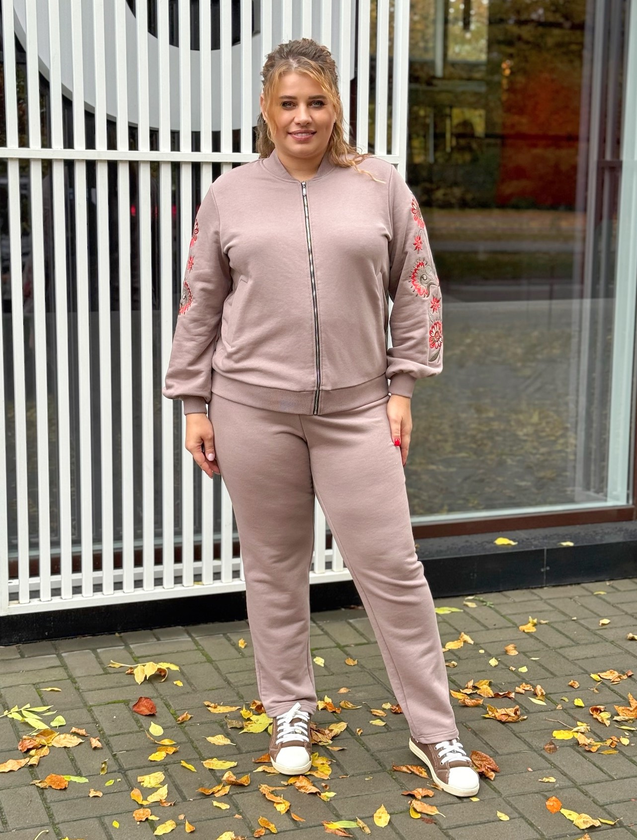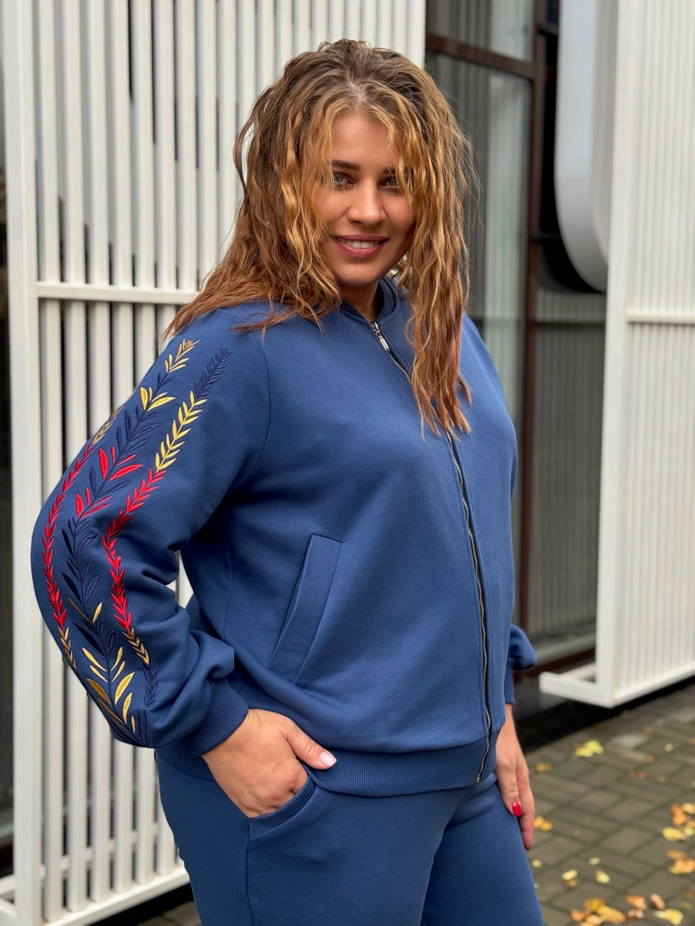 Комплект складається з комфортного бомбера на блискавці та практичних штанів. Особливу увагу привертає дизайнерська кольорова вишивка на рукавах, яка додає образу індивідуальності, яскравого характеру та модного етно-настрою.