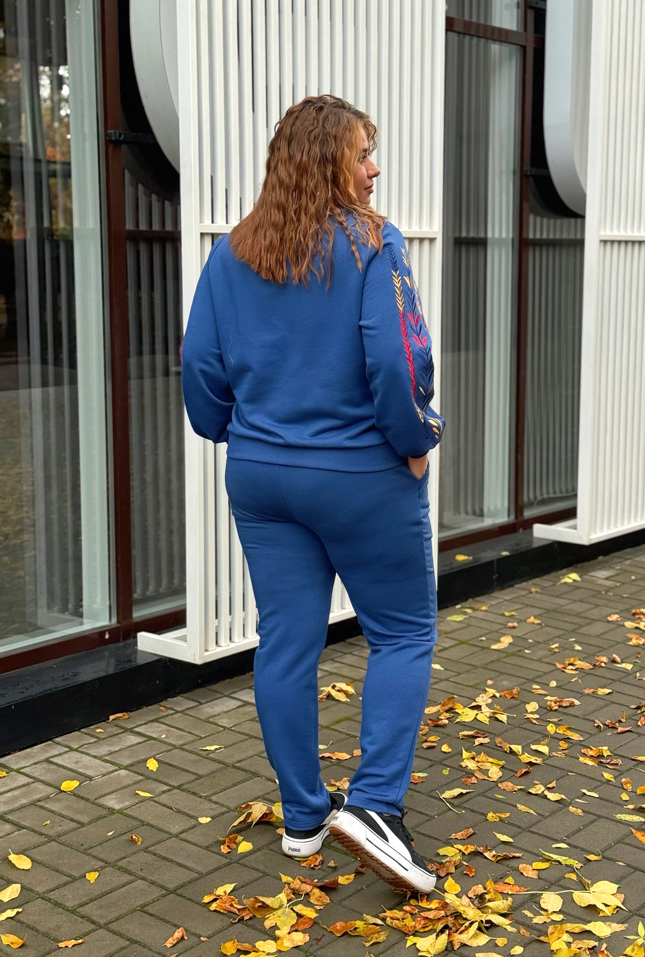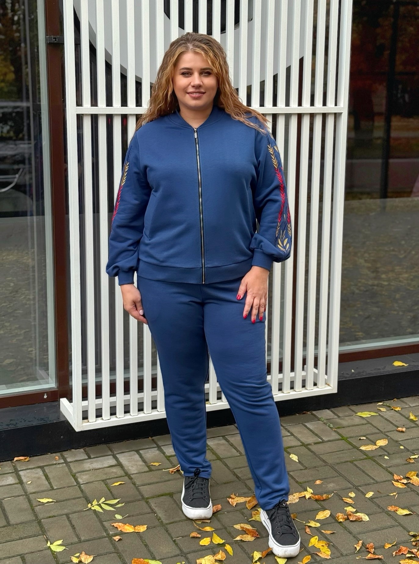 Синій трикотажний костюм великих розмірів з дизайнерською вишивкою