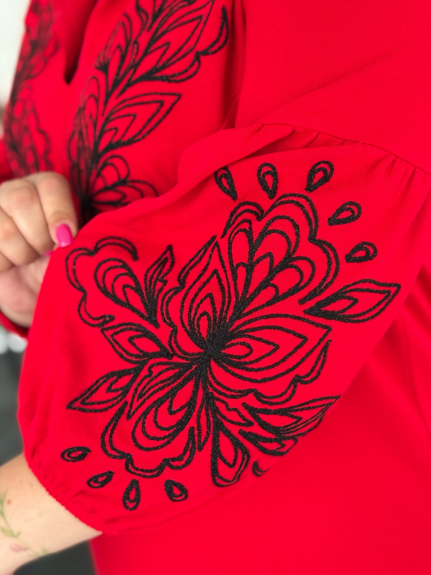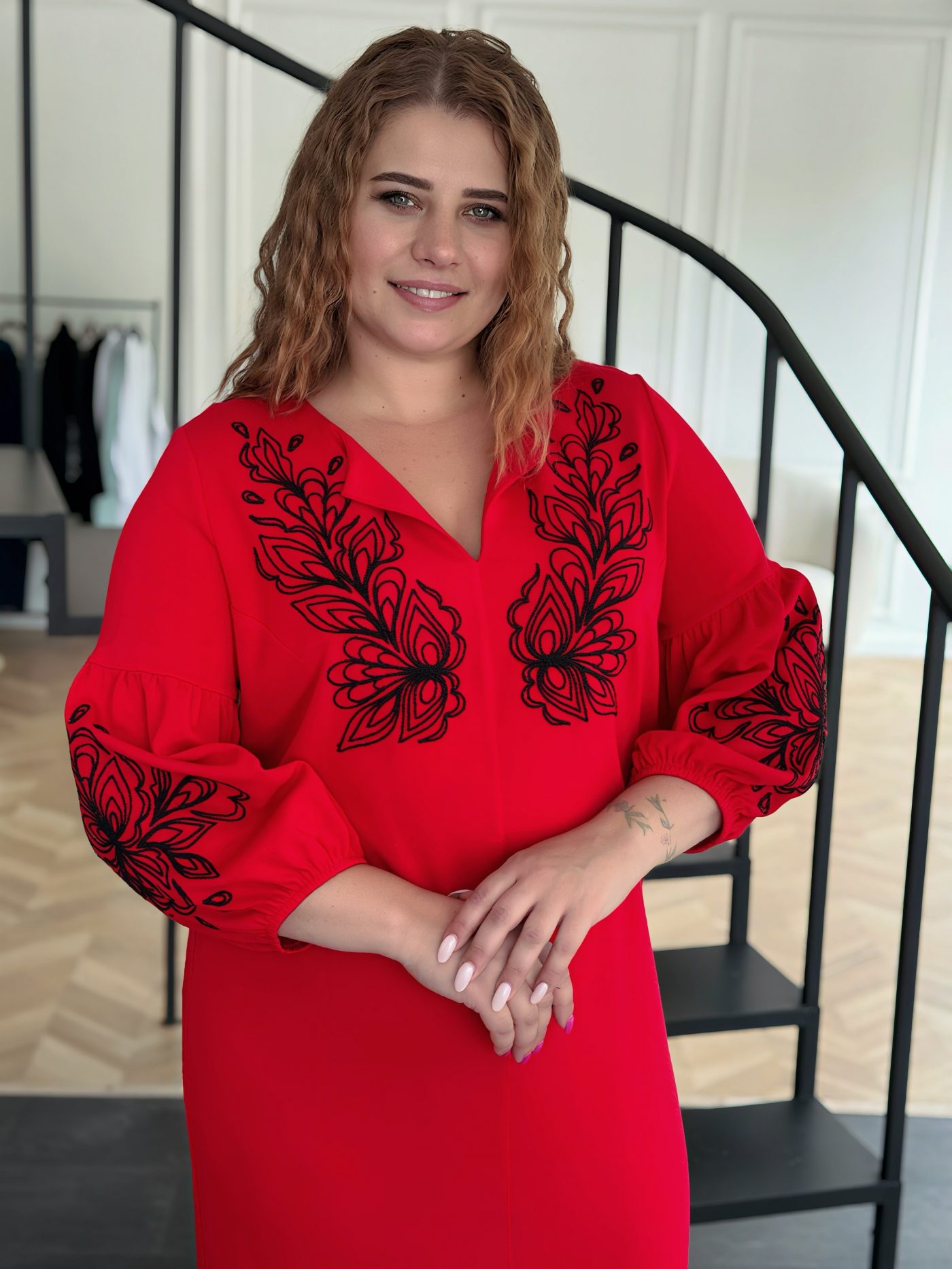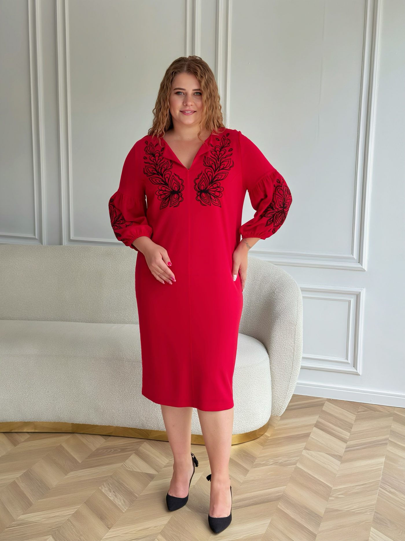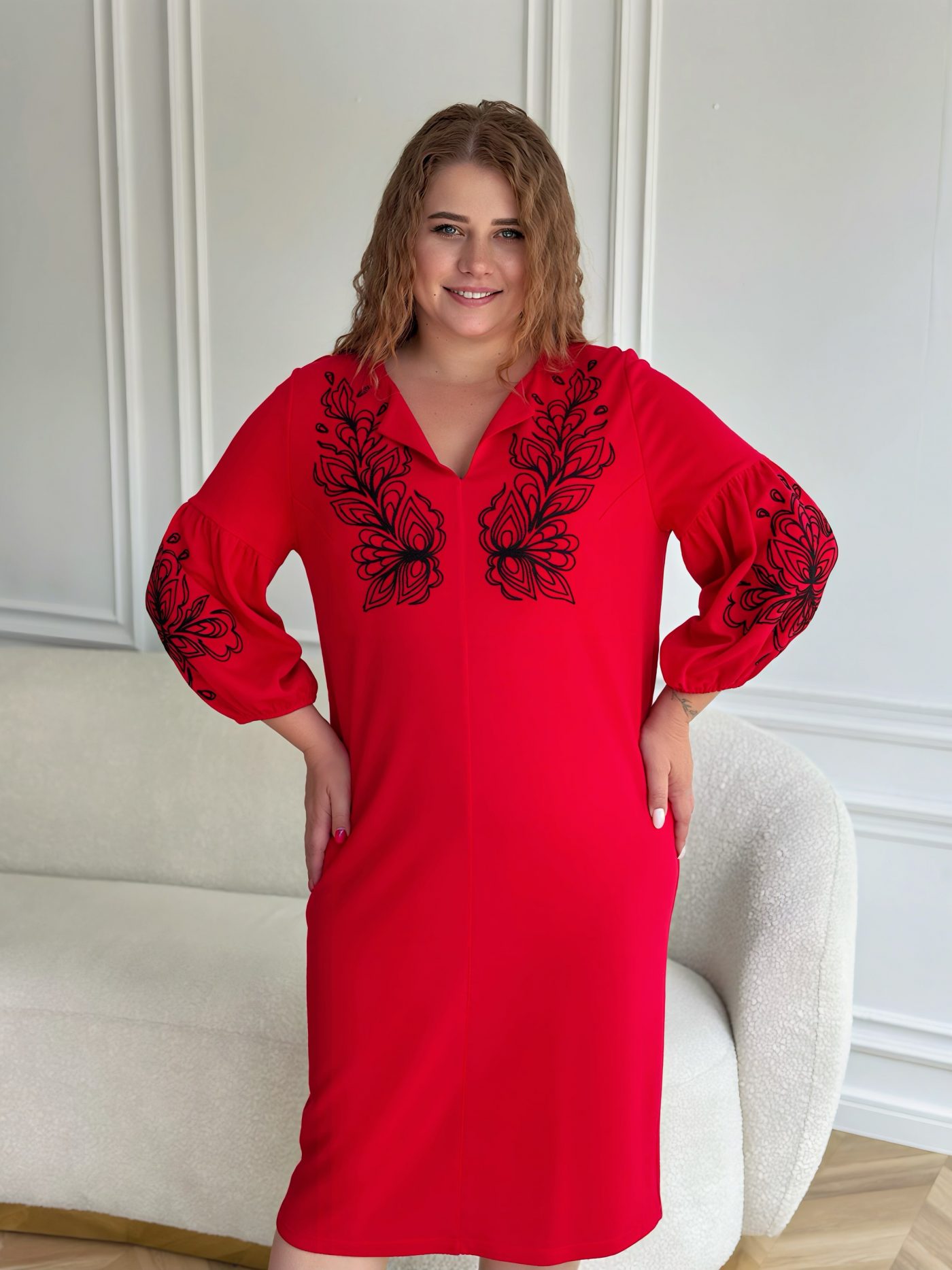 Стильное красное платье прямого кроя с черной вышивкой – большие размеры, французский трикотаж осень-зима