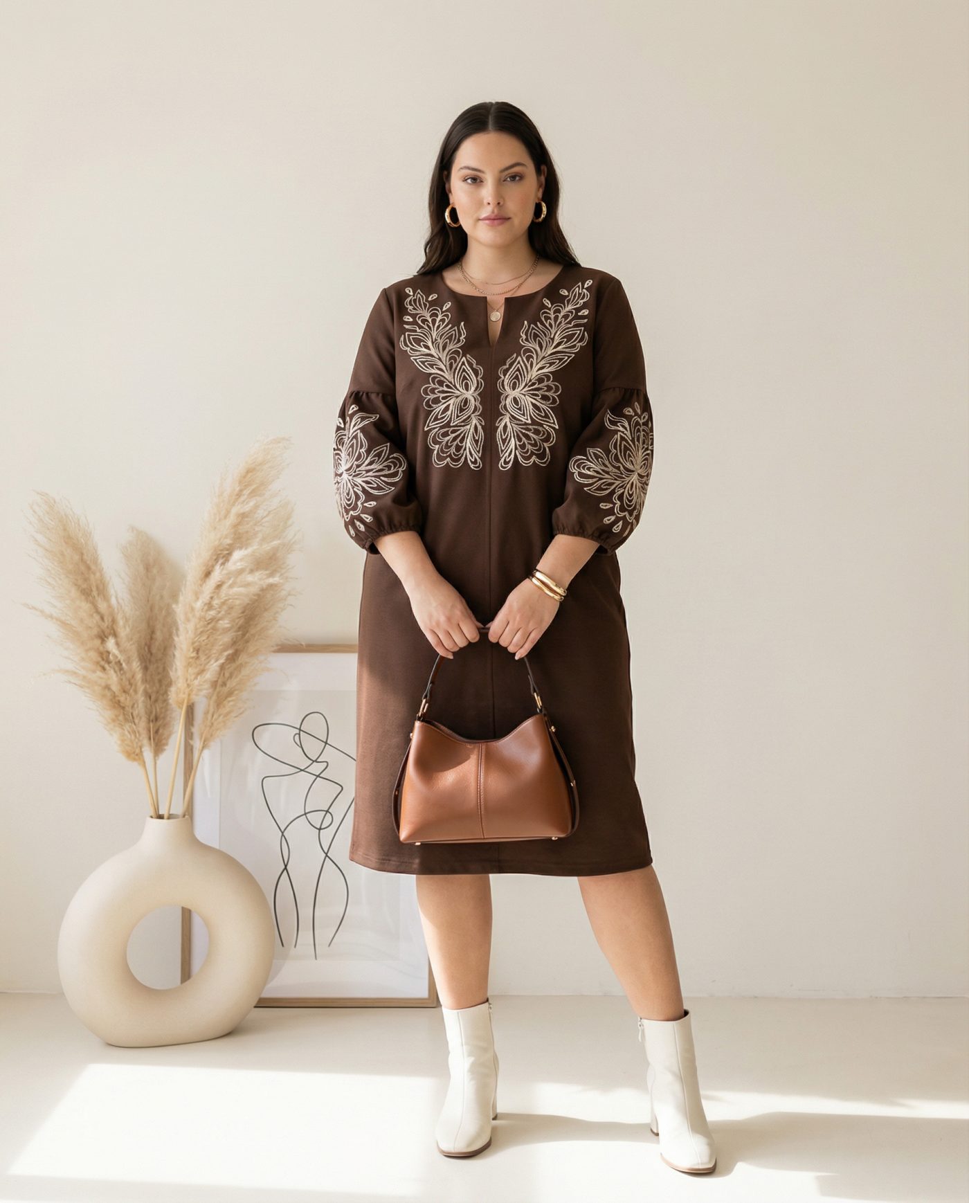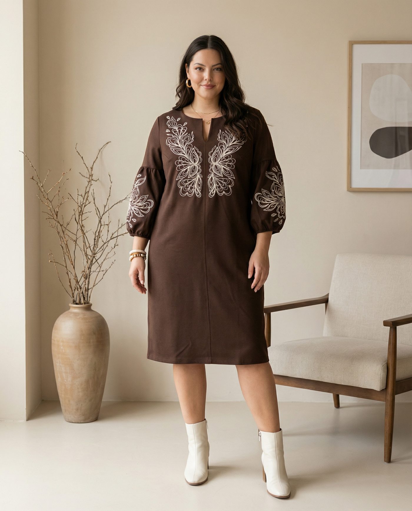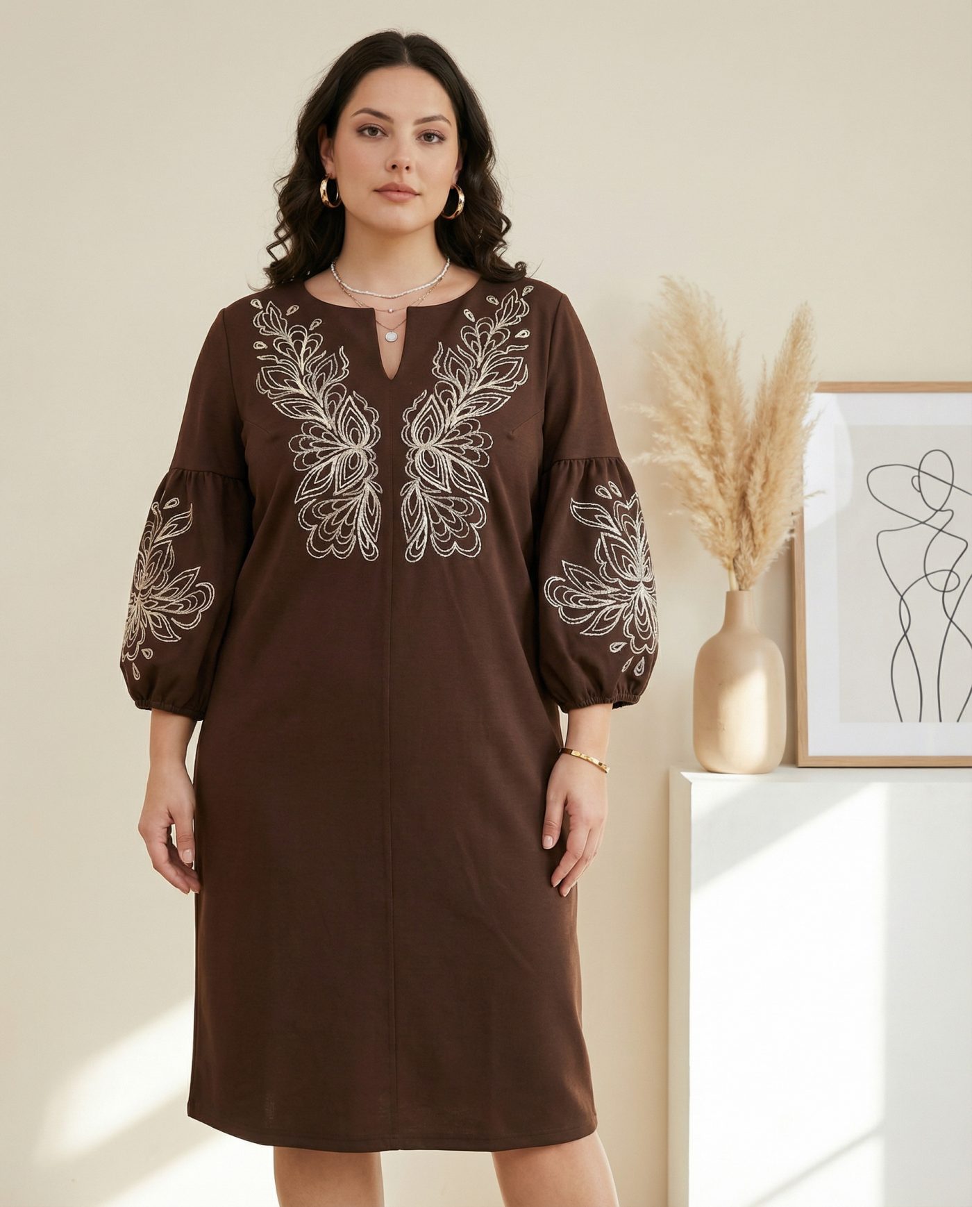 Вишукана контрастна вишивка на грудях і рукавах додає образу характеру та візуально формує силует, роблячи його більш гармонійним. Насичений шоколадний колір виглядає благородно й легко поєднується з різним взуттям та аксесуарами — від класики до повсякденного стилю.