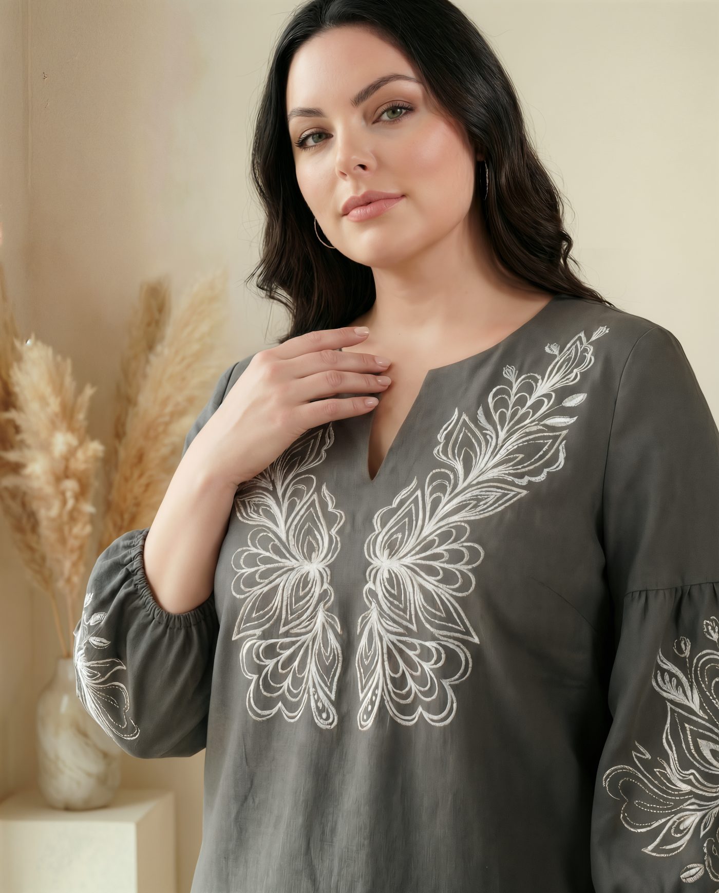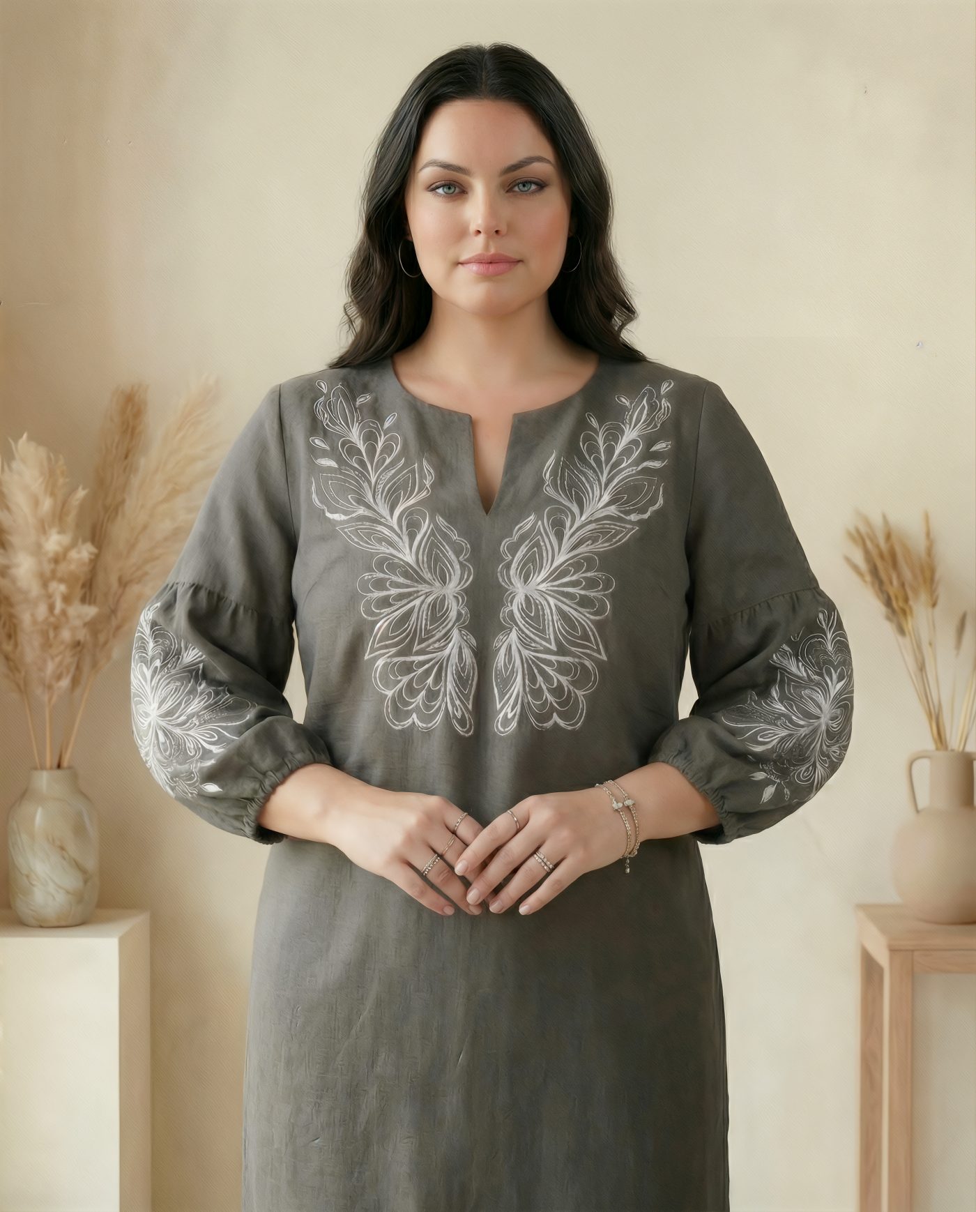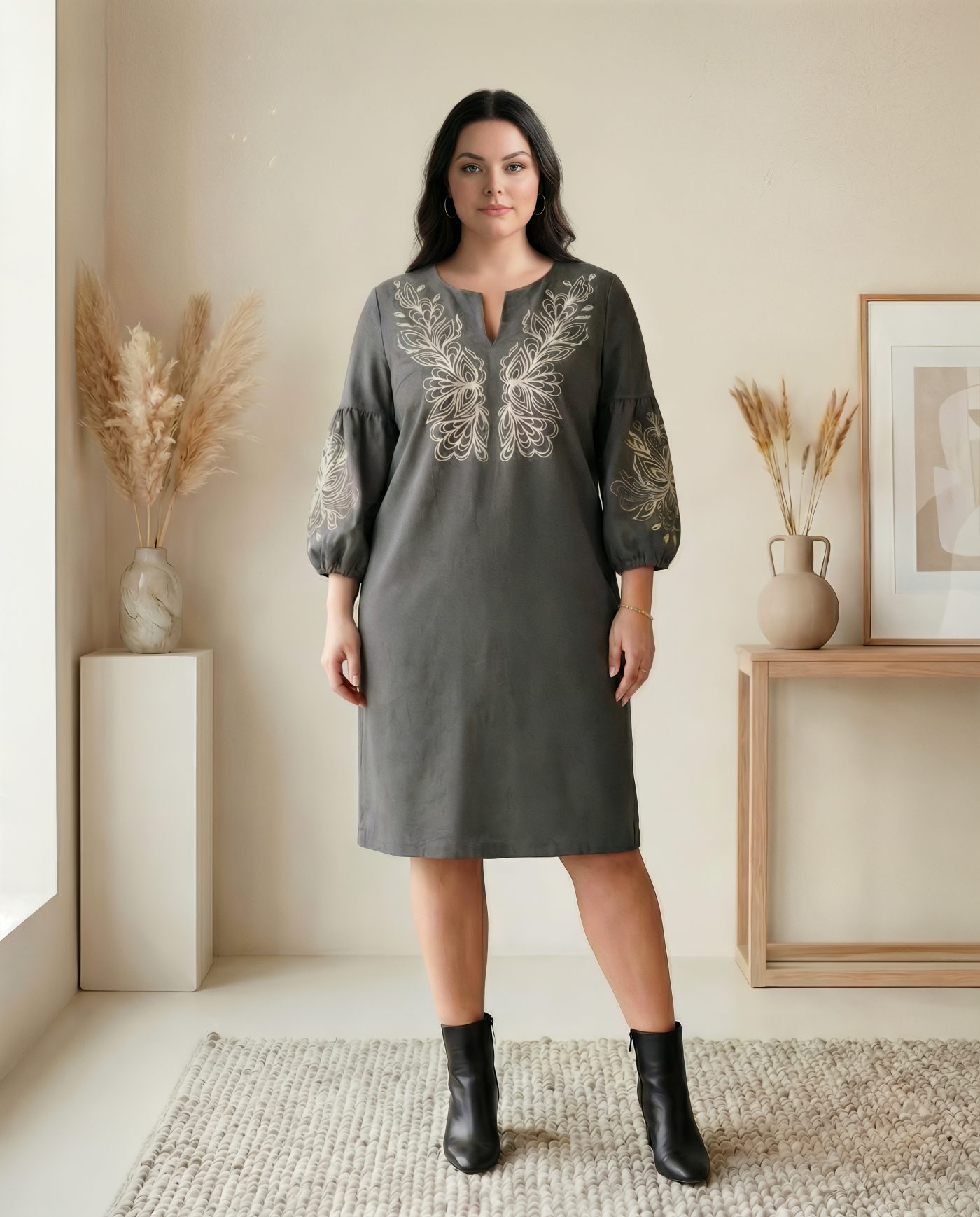 Акцентна вишивка на грудях і рукавах додає образу вишуканості та робить плаття особливим — без зайвого декору, але з характером. Універсальна довжина та спокійний колір дозволяють легко стилізувати модель як для повсякденних виходів, так і для роботи, зустрічей чи святкових подій.