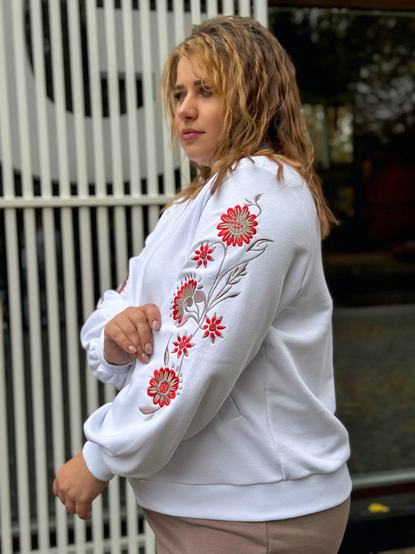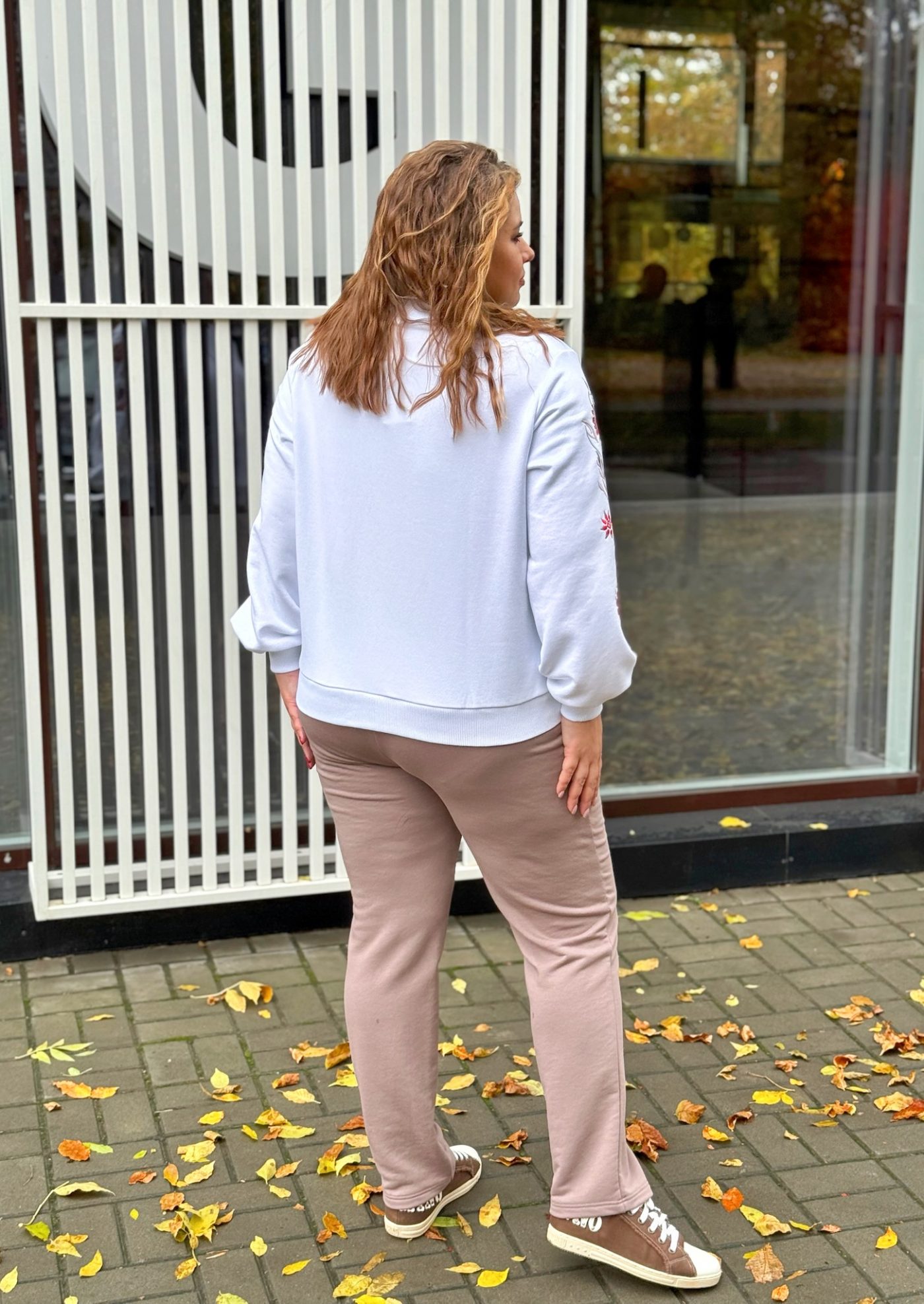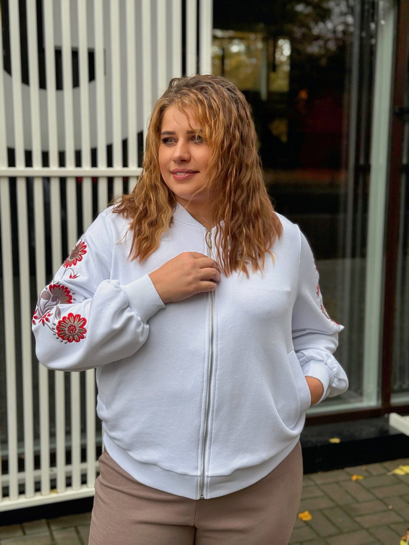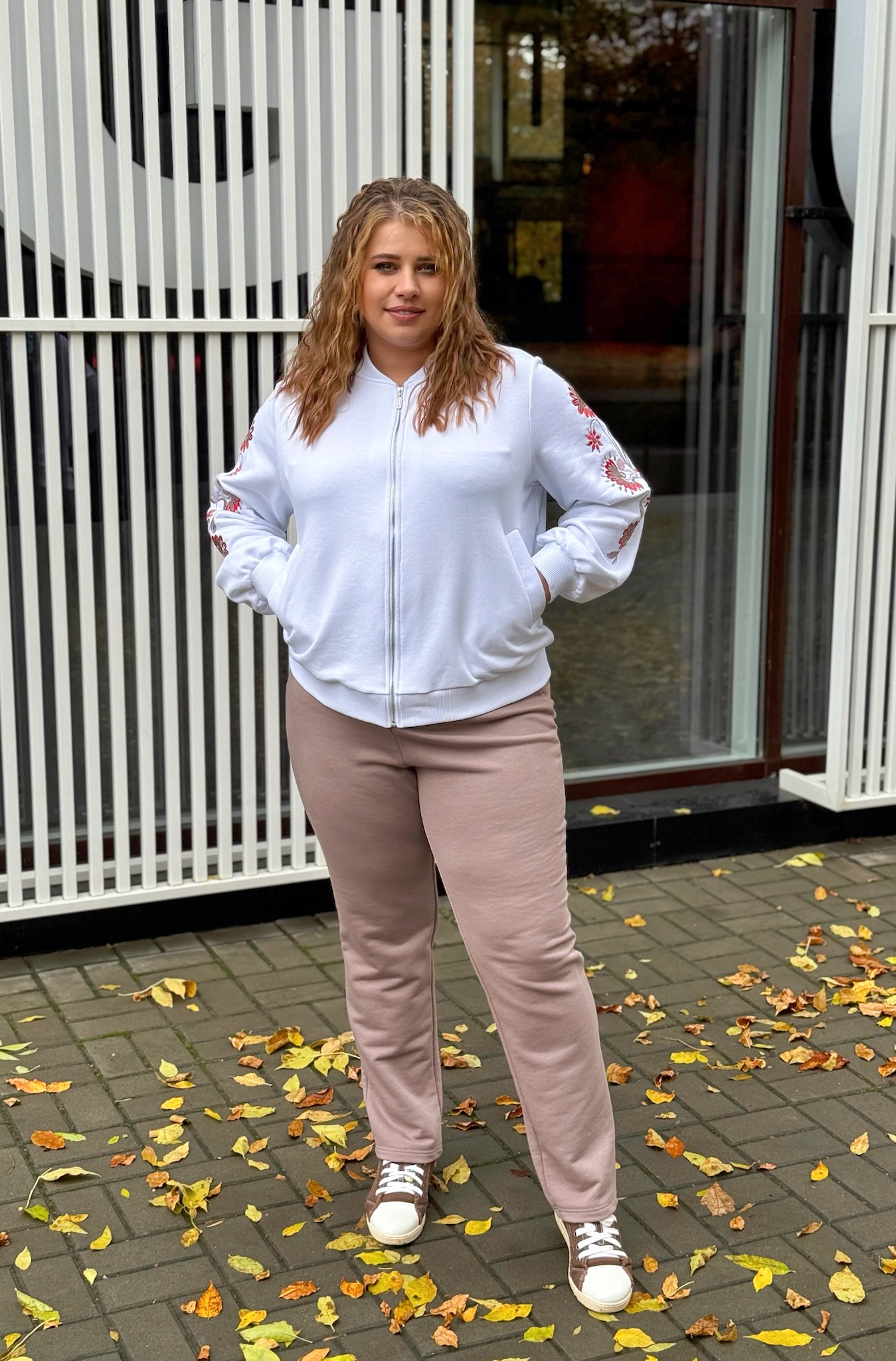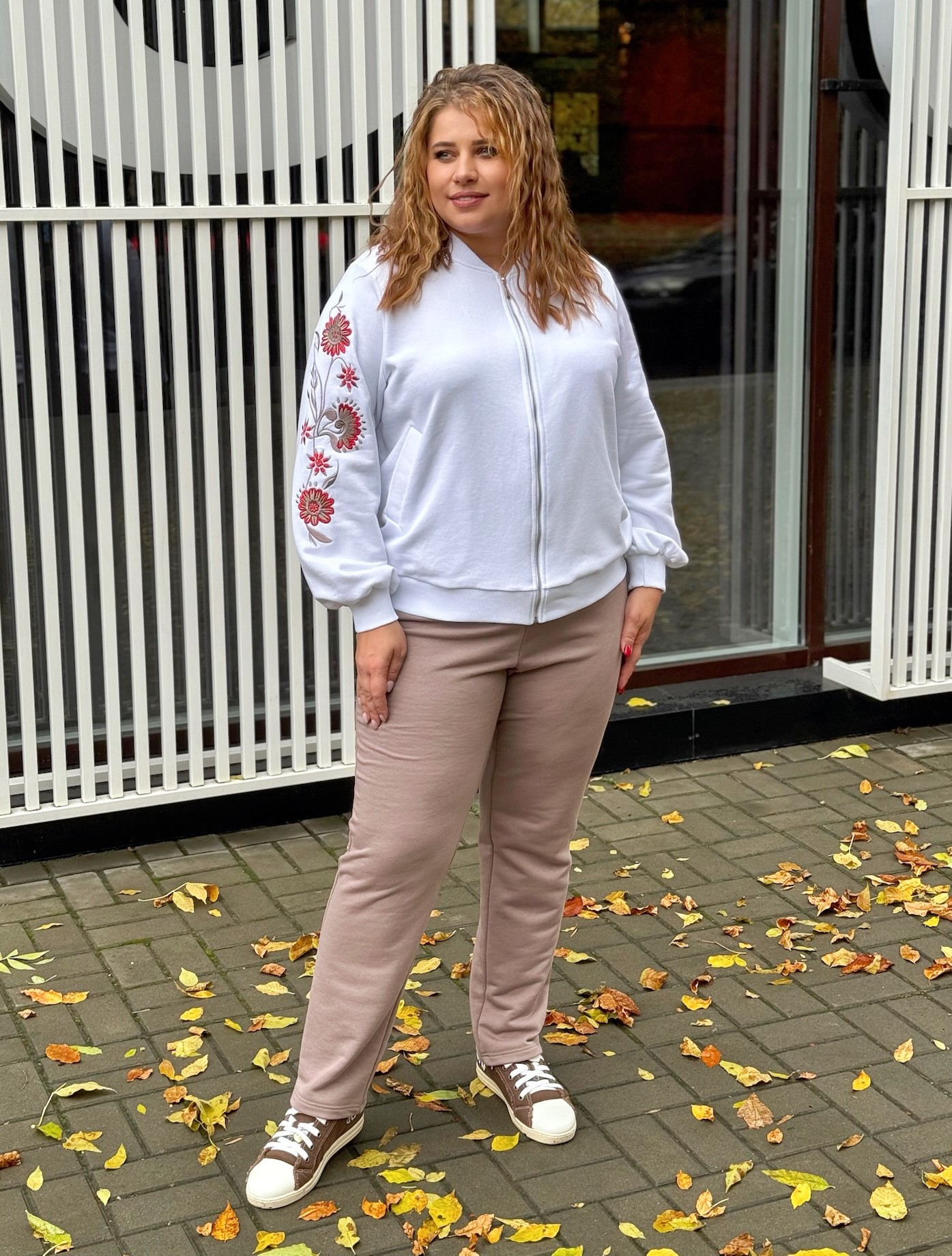 Комплект складається з комфортного бомберу на блискавці та практичних штанів прямого крою. Особливу увагу привертає вишивка на рукаві, що додає образу жіночності, оригінальності та підкреслює індивідуальний стиль.