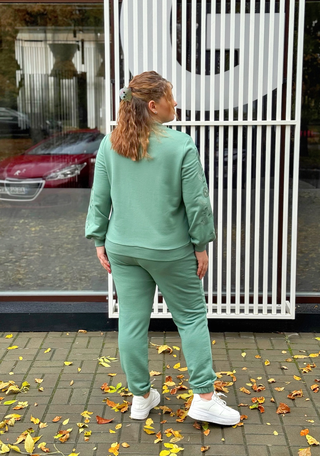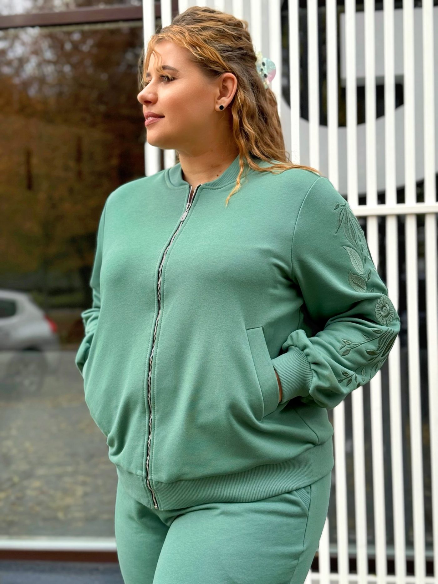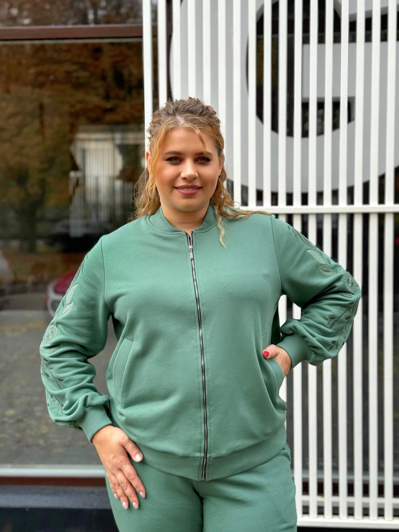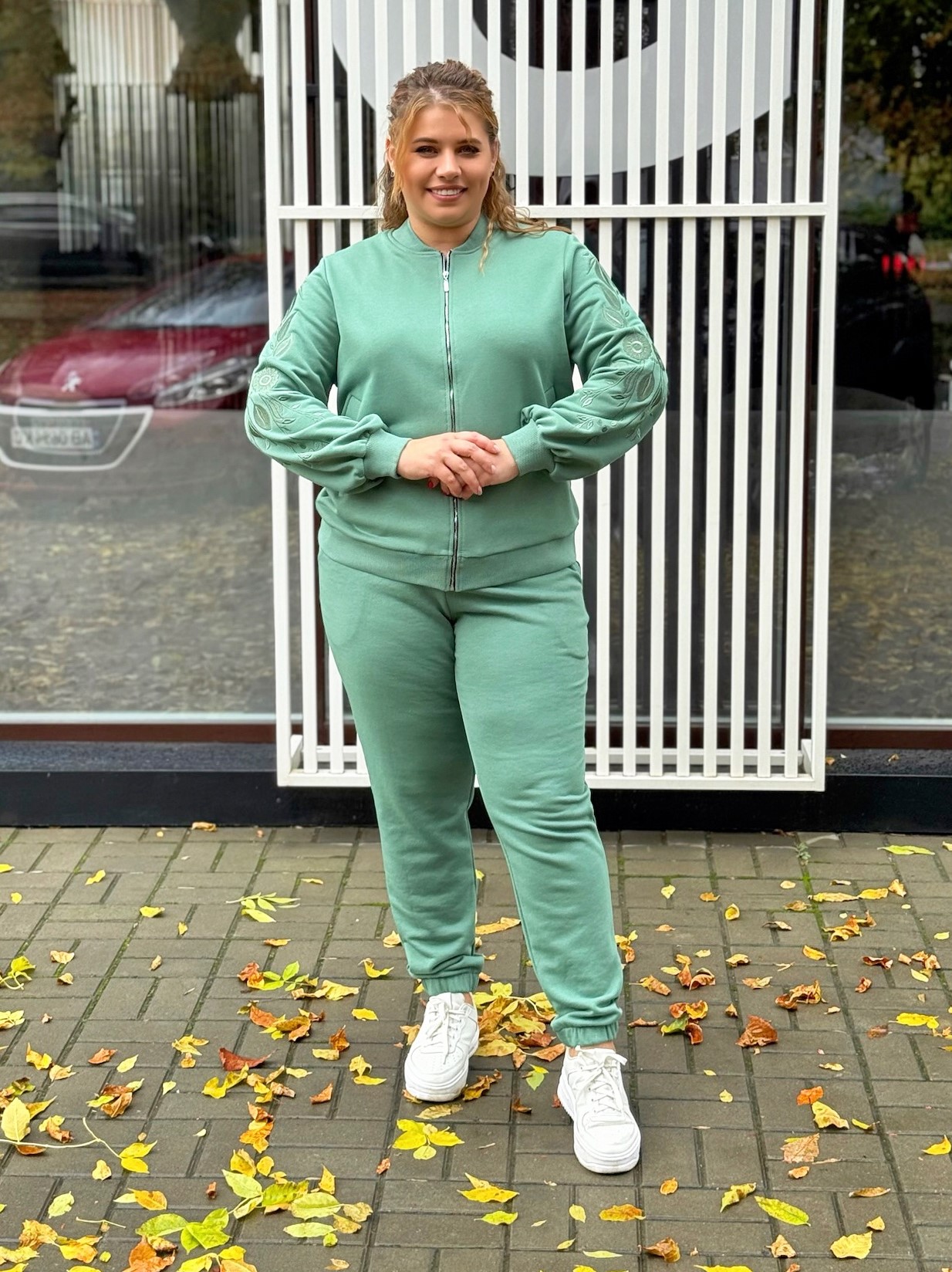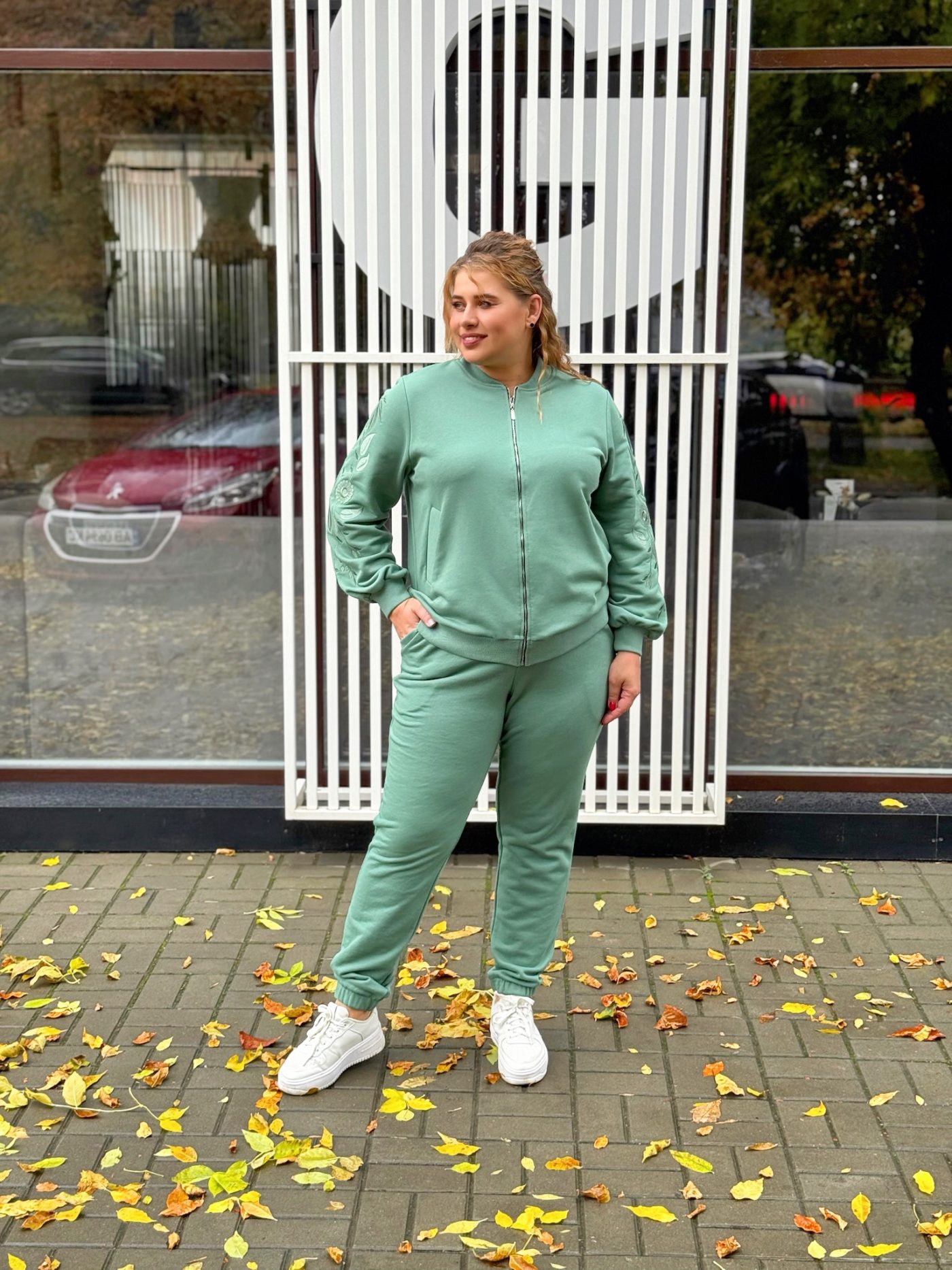 Зелений трикотажний костюм великих розмірів з вишивкою