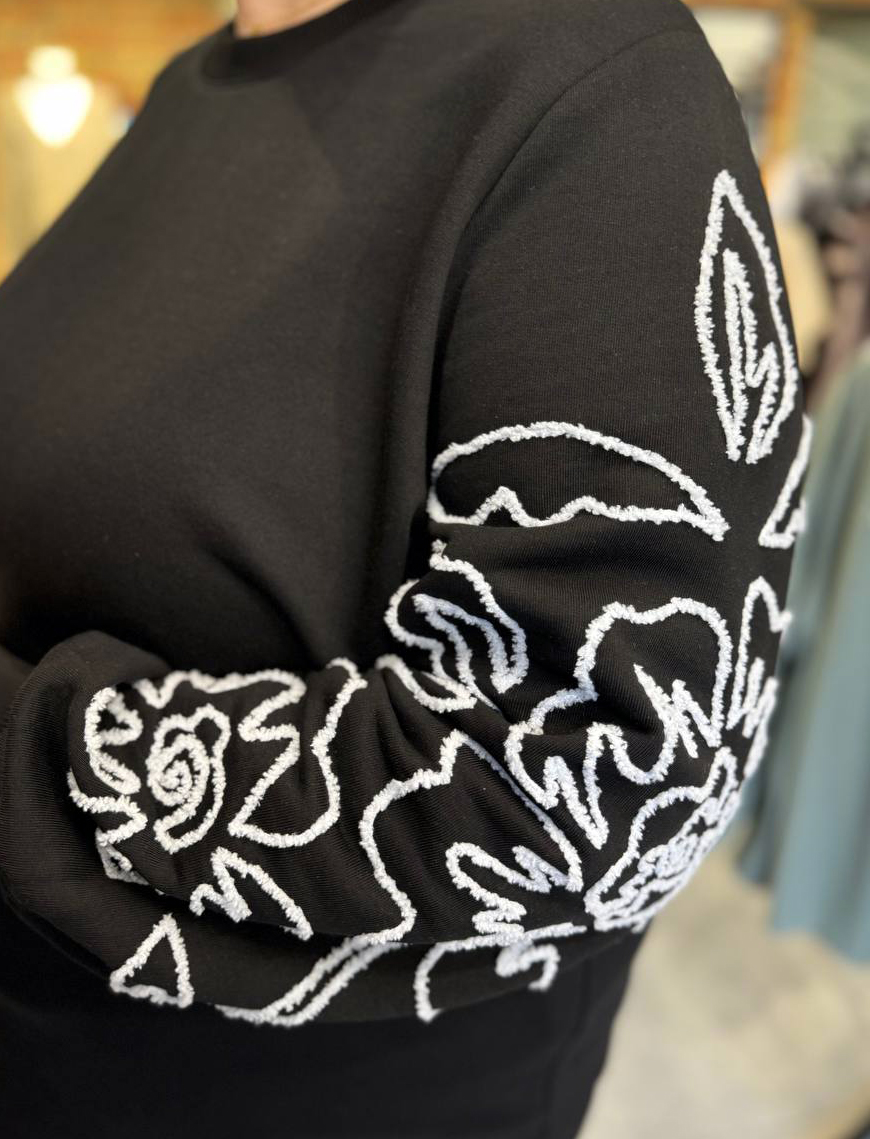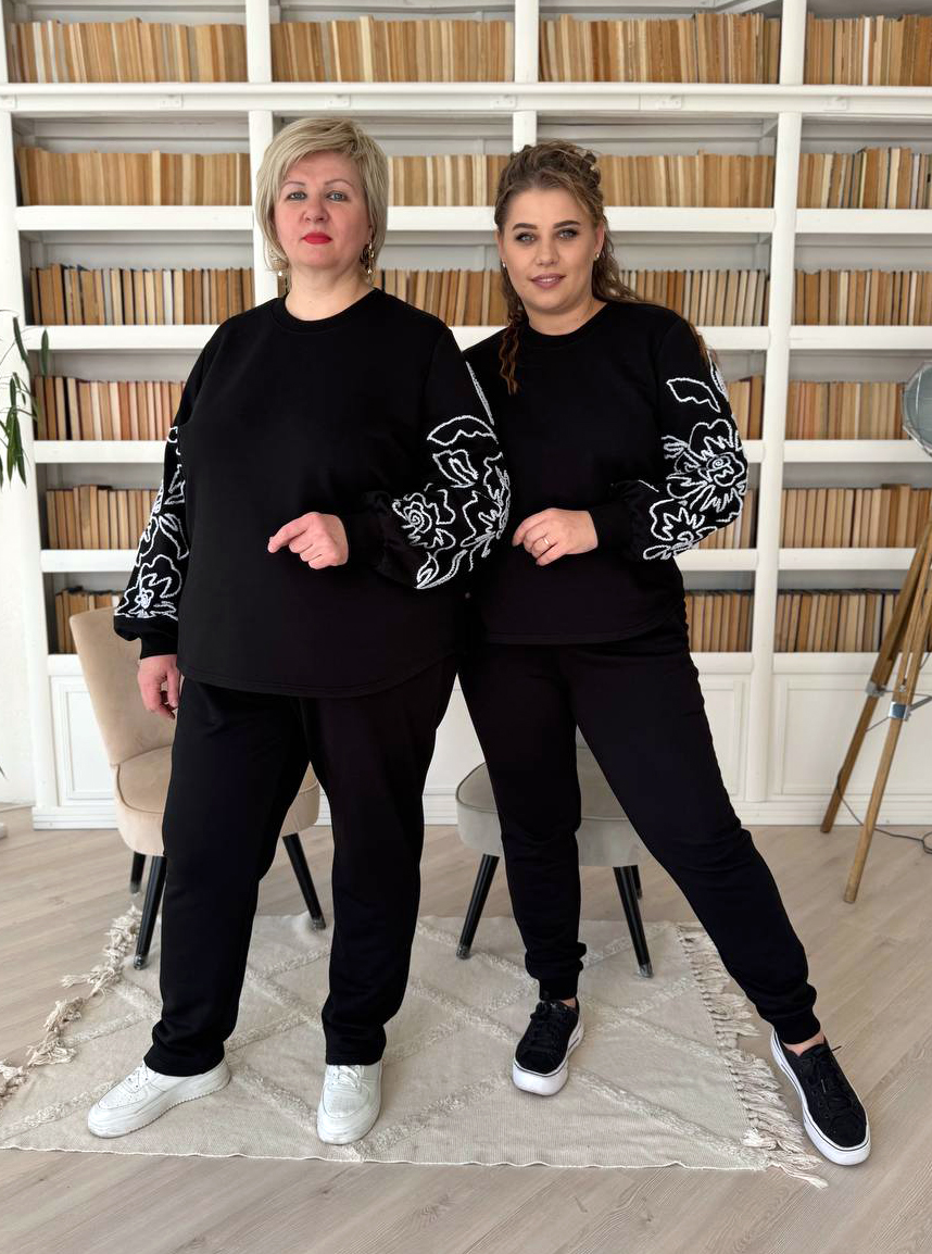 Верх костюма — черный свитшот прямого кроя с эффектной контрастной белой вышивкой на рукавах. Изящный цветочный орнамент добавляет образу нарядности и женственности, при этом сохраняет лаконичность и универсальность. Манжеты на рукавах и по низу изделия обеспечивают идеальную посадку и комфорт в движении.