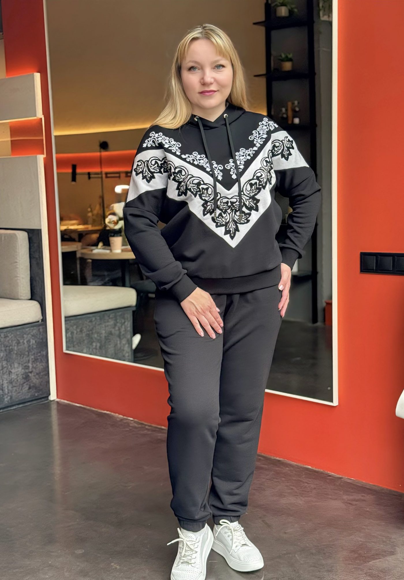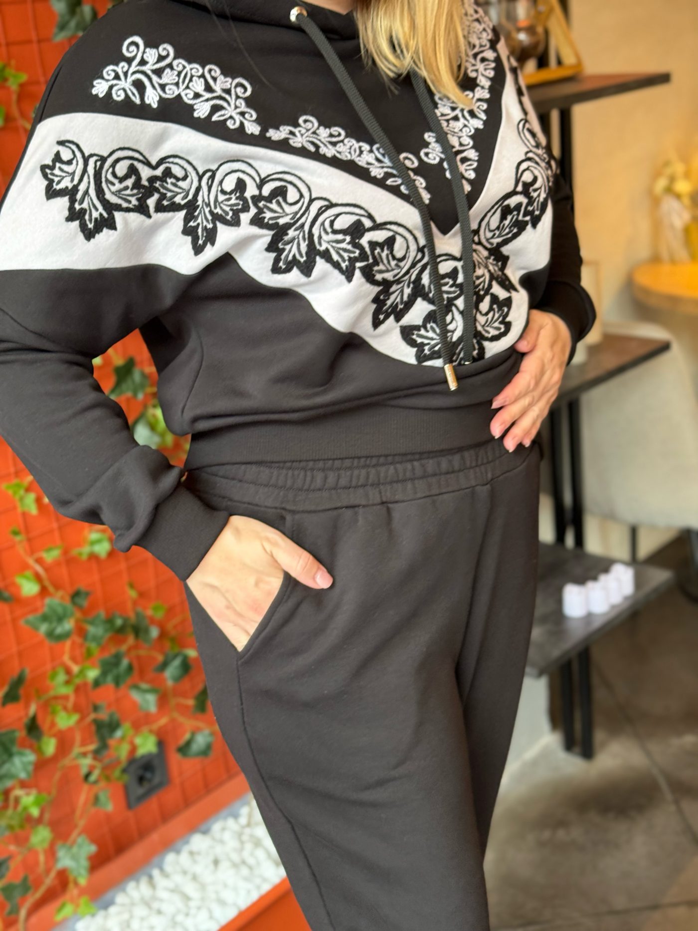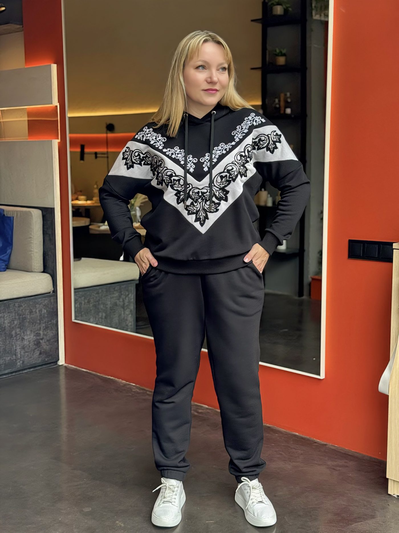 Черный цвет с контрастной белой вышивкой делает костюм универсальным: его можно носить как прогулочный спортивный костюм, так и как нарядный костюм для встреч, путешествий и повседневной жизни.