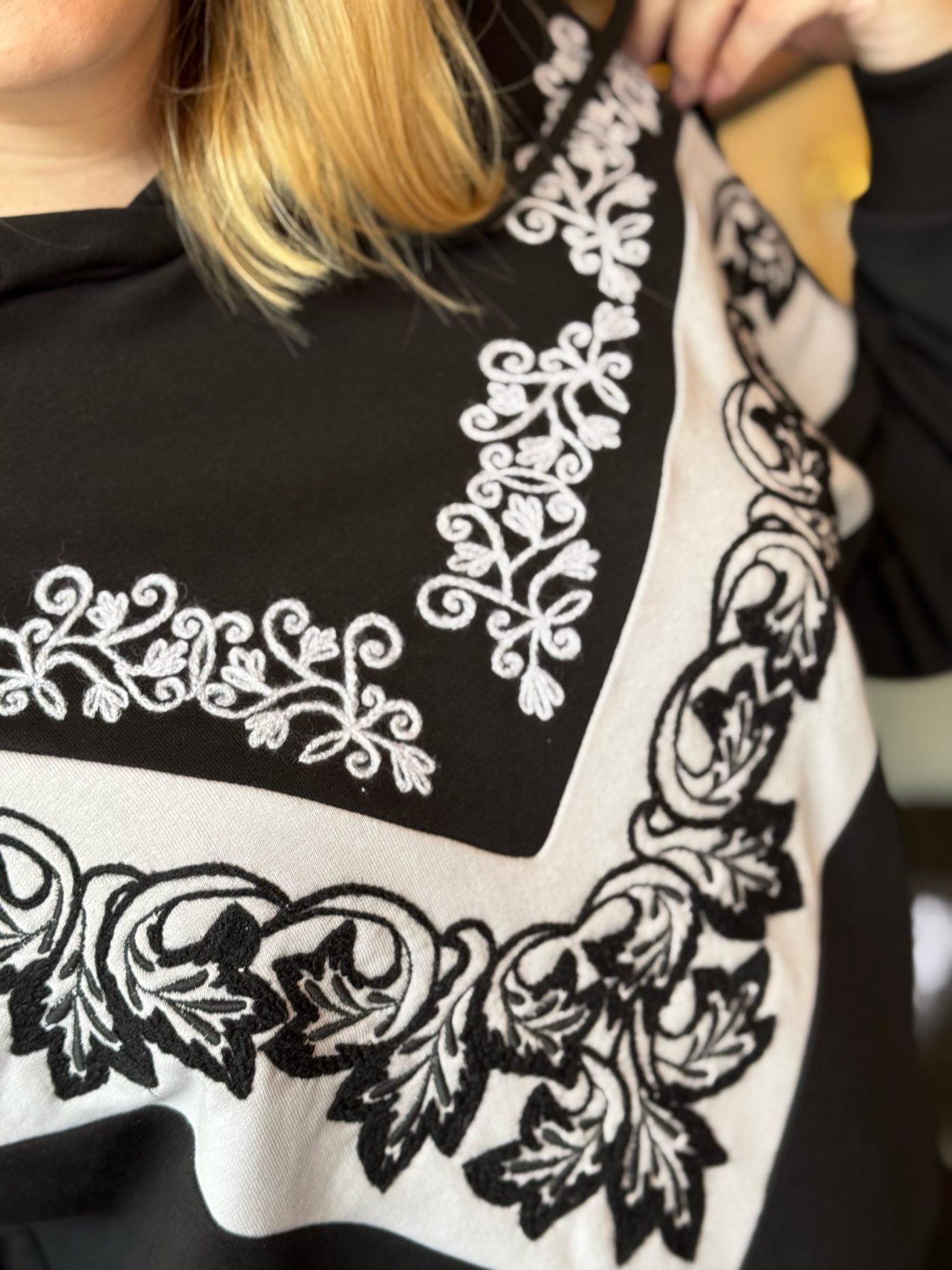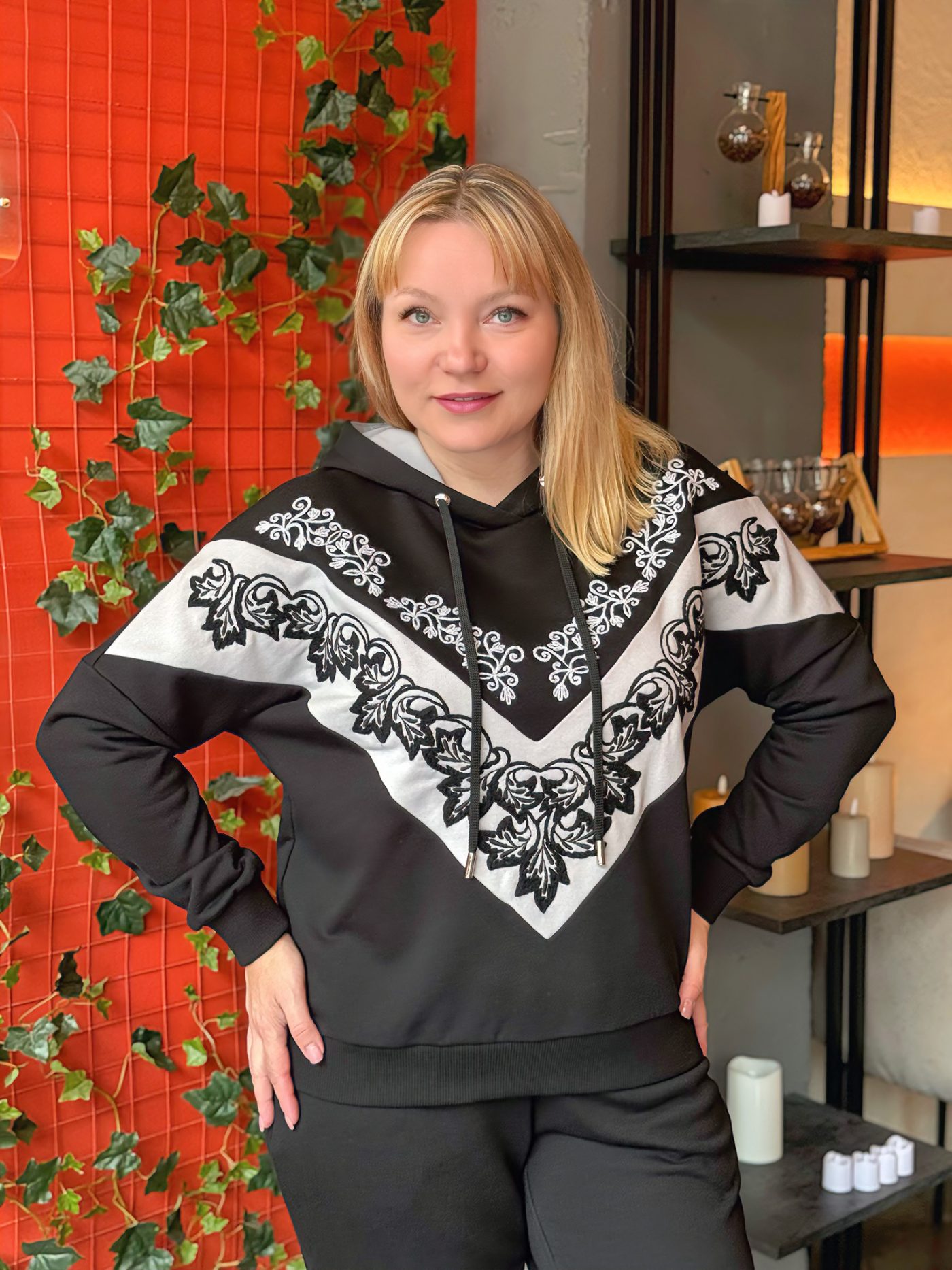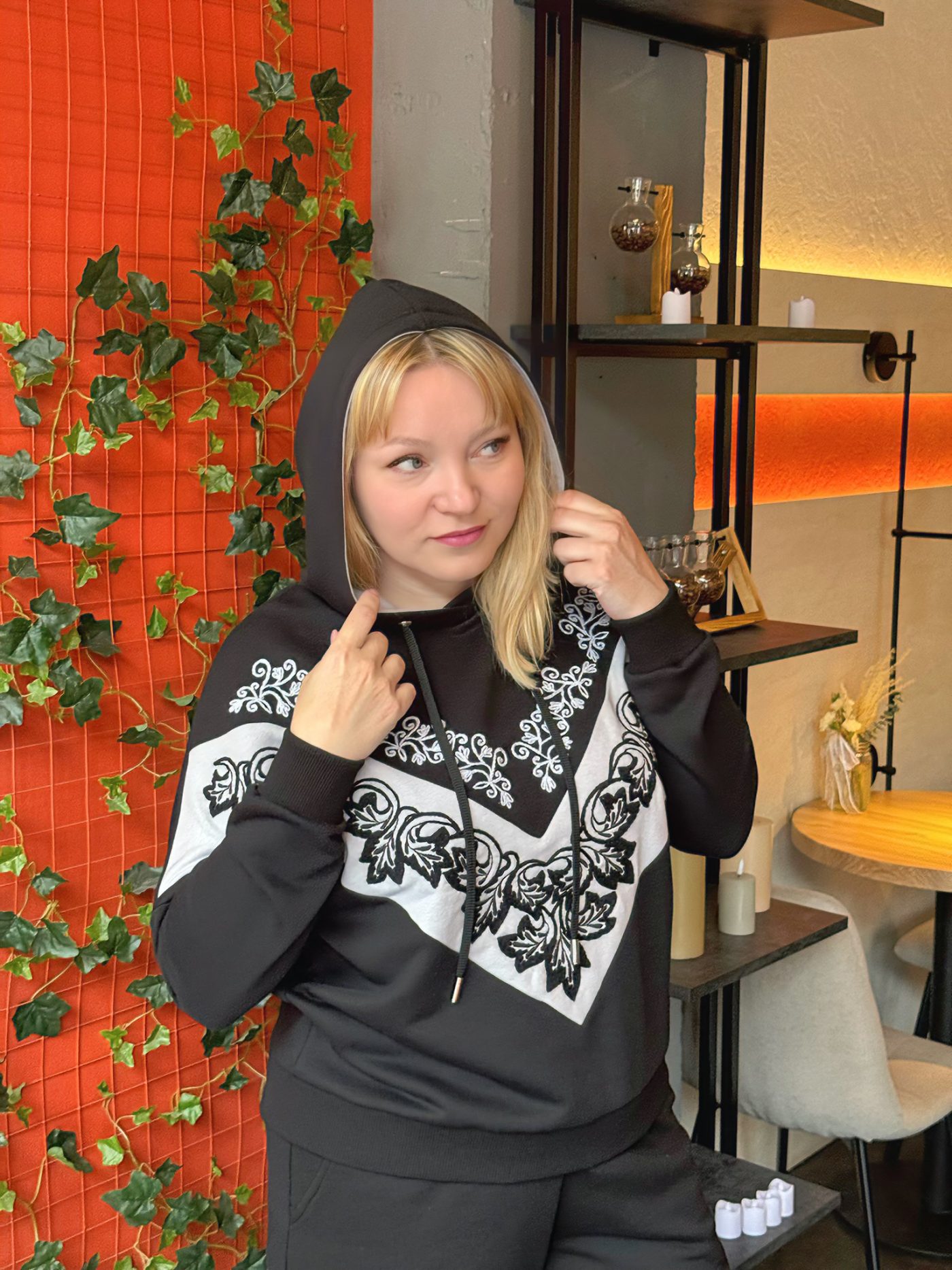 Черный цвет с контрастной белой вышивкой делает костюм универсальным: его можно носить как прогулочный спортивный костюм, так и как нарядный костюм для встреч, путешествий и повседневной жизни.
