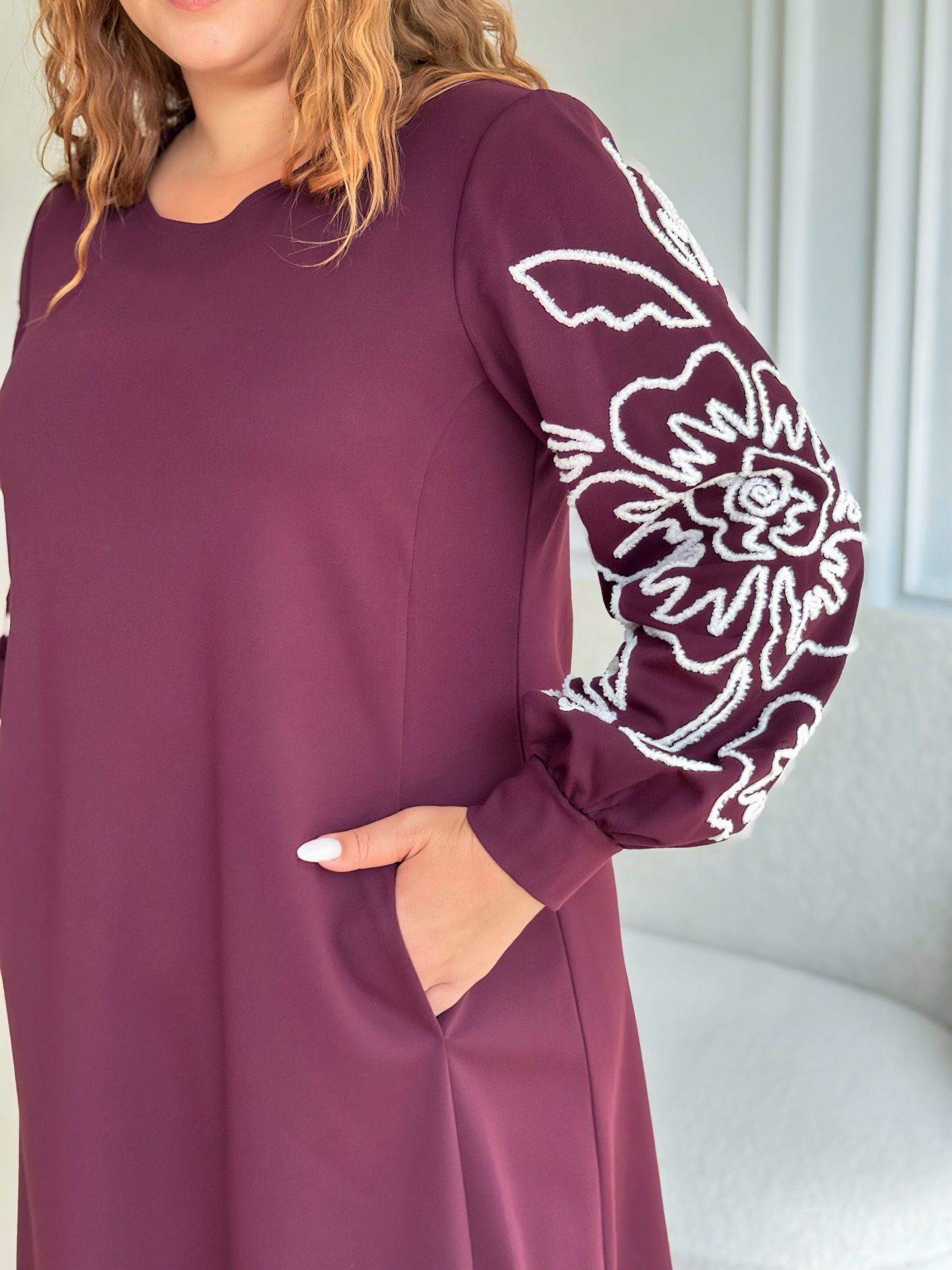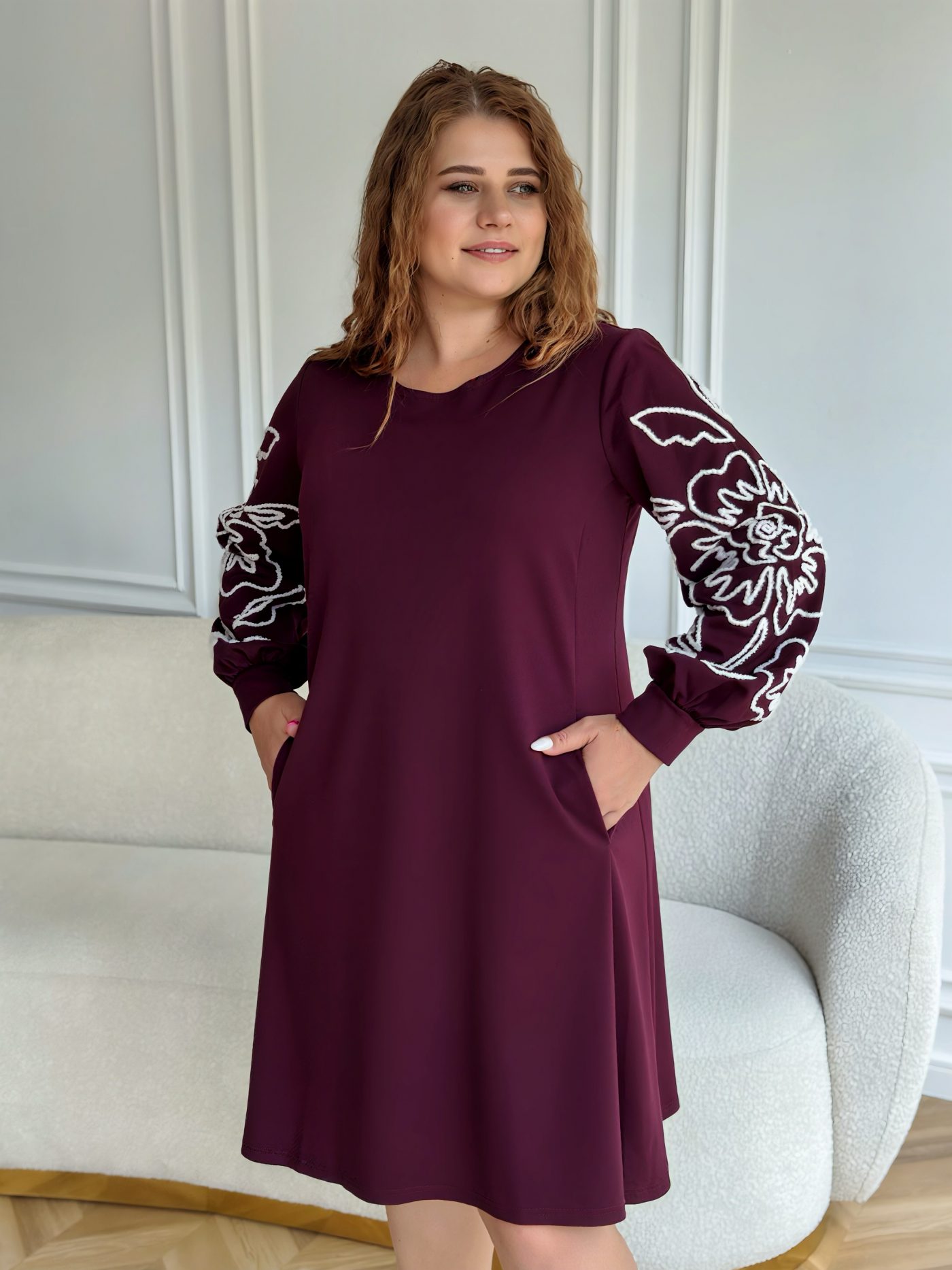 Бордовое платье-трапеция большого размера с вышивкой | Женское платье свободного кроя из французского трикотажа осень-зима